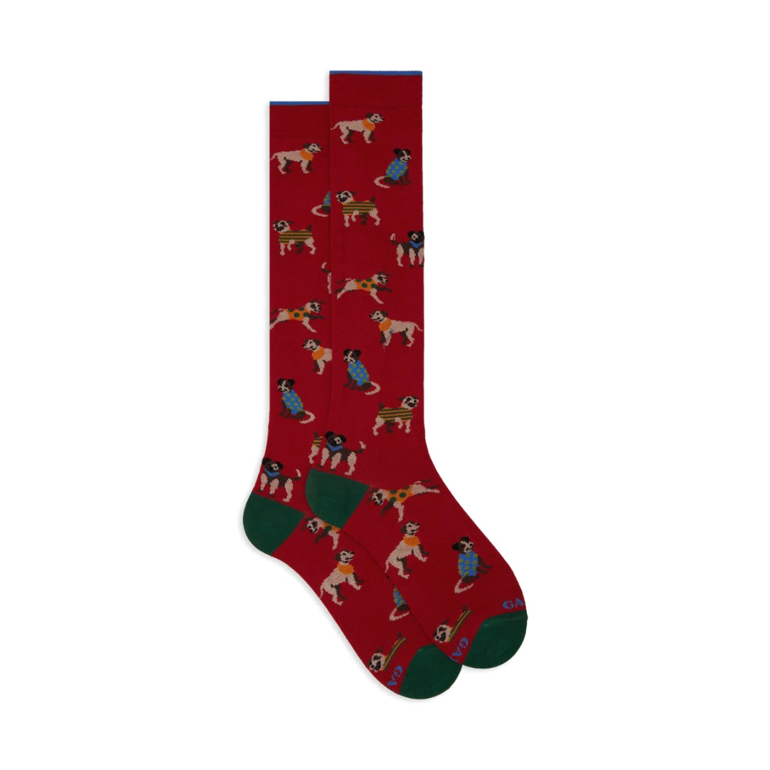 Calze lunghe da uomo in cotone leggero, di colore rosso mattone, realizzate in Italia. Estremamente morbide al tatto, ideali per gli amanti del dettaglio di moda. La fantasia a cani aggiunge un tocco cool e divertente. La vestibilità perfetta Gallo, sinonimo di qualità italiana dal 1927.
