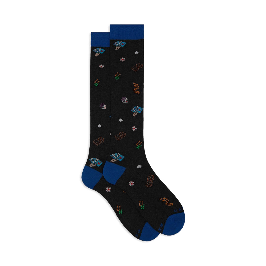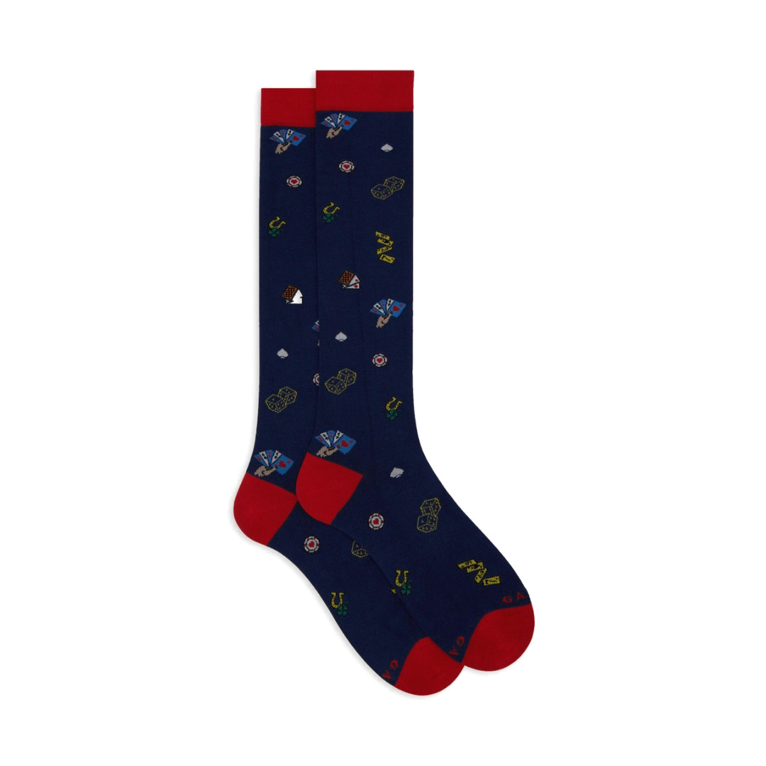 Calze lunghe da uomo in cotone leggerissimo nei toni del blu, realizzate in Italia. Molto morbide al tatto, create per chi non rinuncia ad un dettaglio di stile. La fantasia carte e dadi, le rende originali ma riconoscibili. Adatte ad un look formale o frizzante. La vestibilità perfetta Gallo, sinonimo di qualità italiana dal 1927.