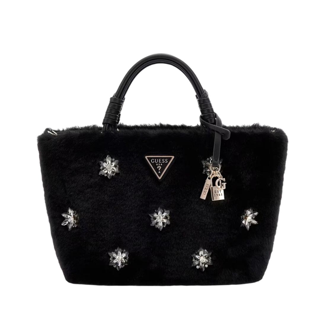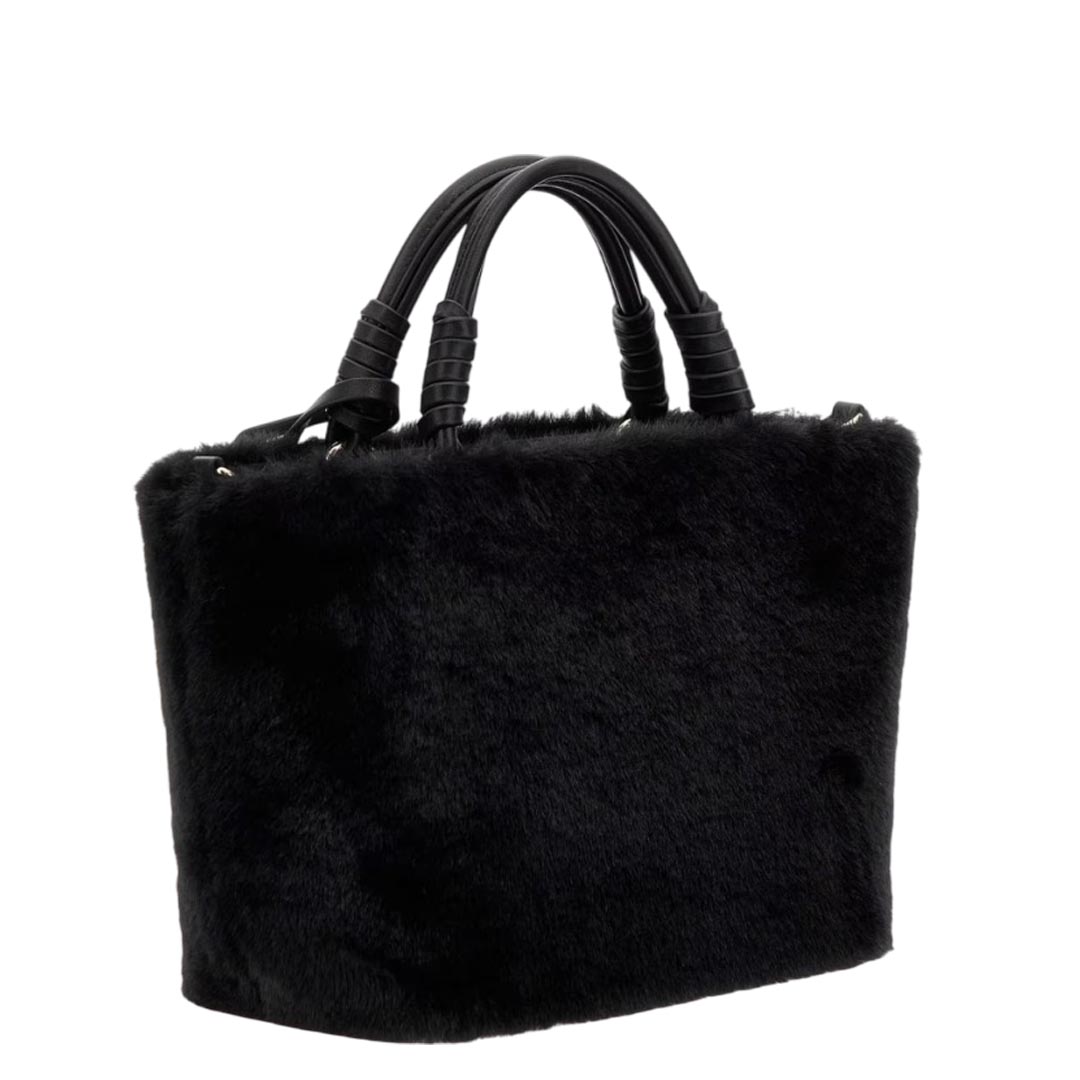 Esterno in pelliccia sintetica. Chiusura con cerniera lampo. Metalleria color oro pallido. Famiglia:Shaida Applicazioni gioiello a fiore frontali. Charm logato removibile alla base del manico. Fodera personalizzata con logo. Tasca interna con cerniera lampo. Triangolo logo in metallo frontale.