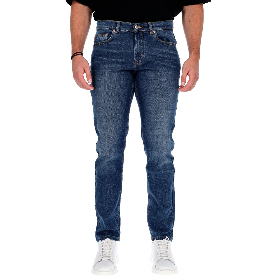 Jeans a 5 tasche uomo con taschino a filetto, chiusura con zip e bottone e tasche posteriori con dettaglio in tessuto e monogramma ricamato