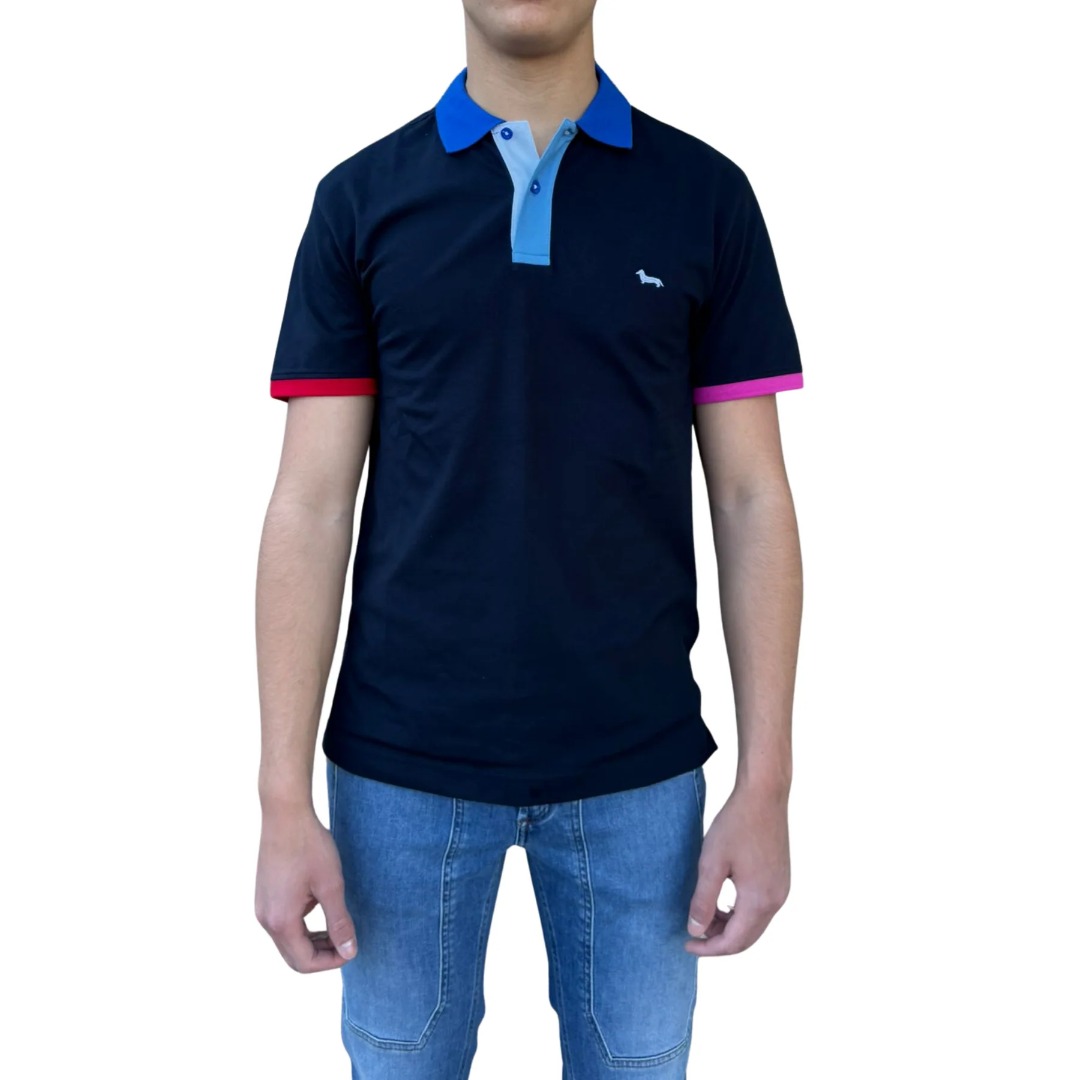 Iconic leader and symbol of Harmont & Blaine's creativity, the Vietri men's short-sleeved polo made of pure cotton is characterized by a dynamic collar made of contrasting shirt fabric. The garment, offered in a comfortable regular fit, is distinguished by the small placket with visible first button and by the inevitable contrasting dachshund embroidery on the heart side.