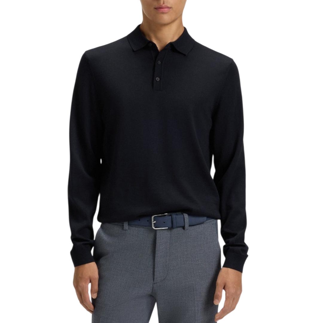Un originale maglione BOSS con colletto polo. Questo capo slim fit è realizzato in filato morbido e traspirante. Questo capo è realizzato con lana proveniente da allevamenti responsabili. Per noi, essere un allevamento responsabile significa essere mulesing-free e rispettare gli standard previsti dalle Cinque libertà per la tutela degli animali. Slim fit Colletto polo Manica lunga Polsini a costine