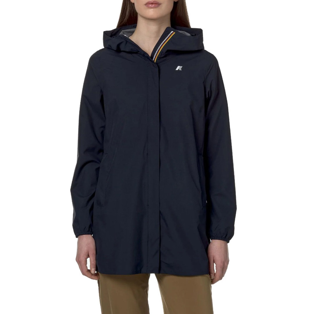 Sophie è una giacca da donna con lunghezza a tre quarti e vestibilità slim, ideale per le mezze stagioni, realizzata in tessuto tecnico elasticizzato e riciclato, che segue i movimenti e protegge dal vento e dalla pioggia fino a 5000 colonne d’acqua. L'interno è foderato con una membrana isolante decorata con lettering K-Way stampato all over in tonalità argento. Le tasche laterali con zip, il cappuccio avvolgente e i polsini con inserti elastici sono dettagli funzionali che garantiscono aderenza e una vestibilità comoda e veloce. Tessuto poliestere riciclato elasticizzato, impermeabile, idrorepellente, antivento, traspirante Membrana interna stampata con logo Cuciture termonastrate Cappuccio regolabile con corda elastica Chiusura con zip Polsi con elastico 2 tasche con zip Fitting regolare Logo stampato bianco