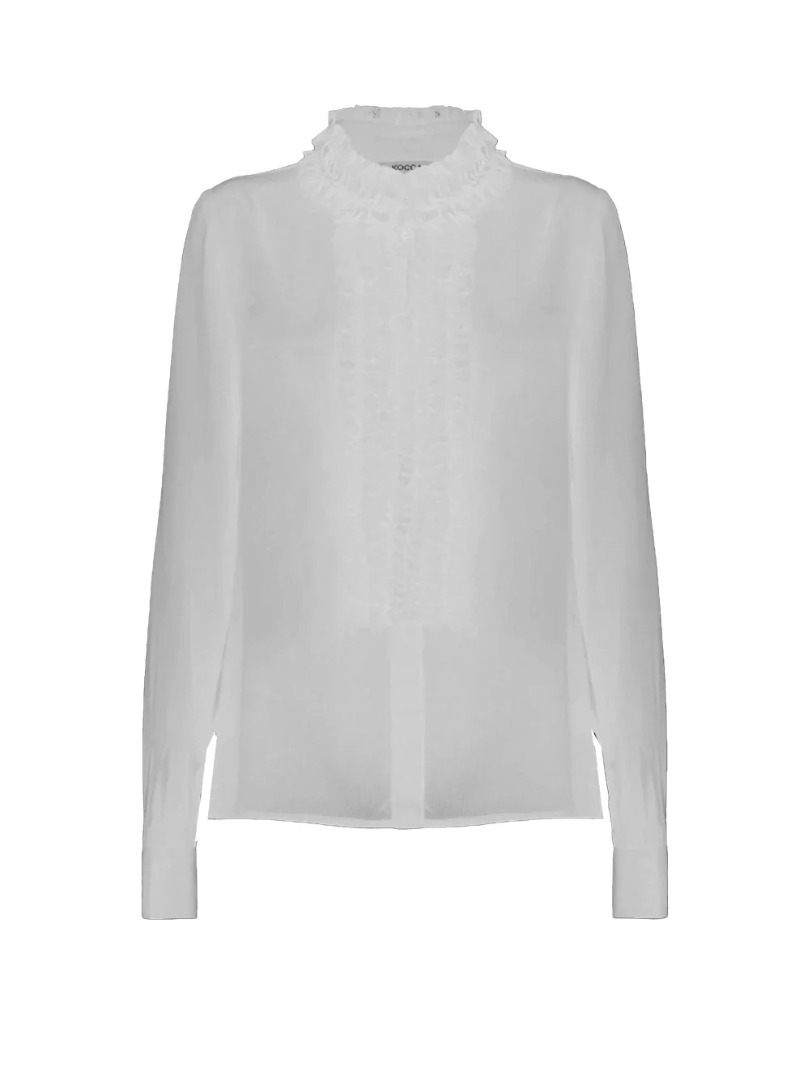 Camicia dalla vestibilità scivolata, caratterizzata da collo e abbottonatura nascosta arricchiti con rouches. Femminile ed elegante per un look impeccabile.