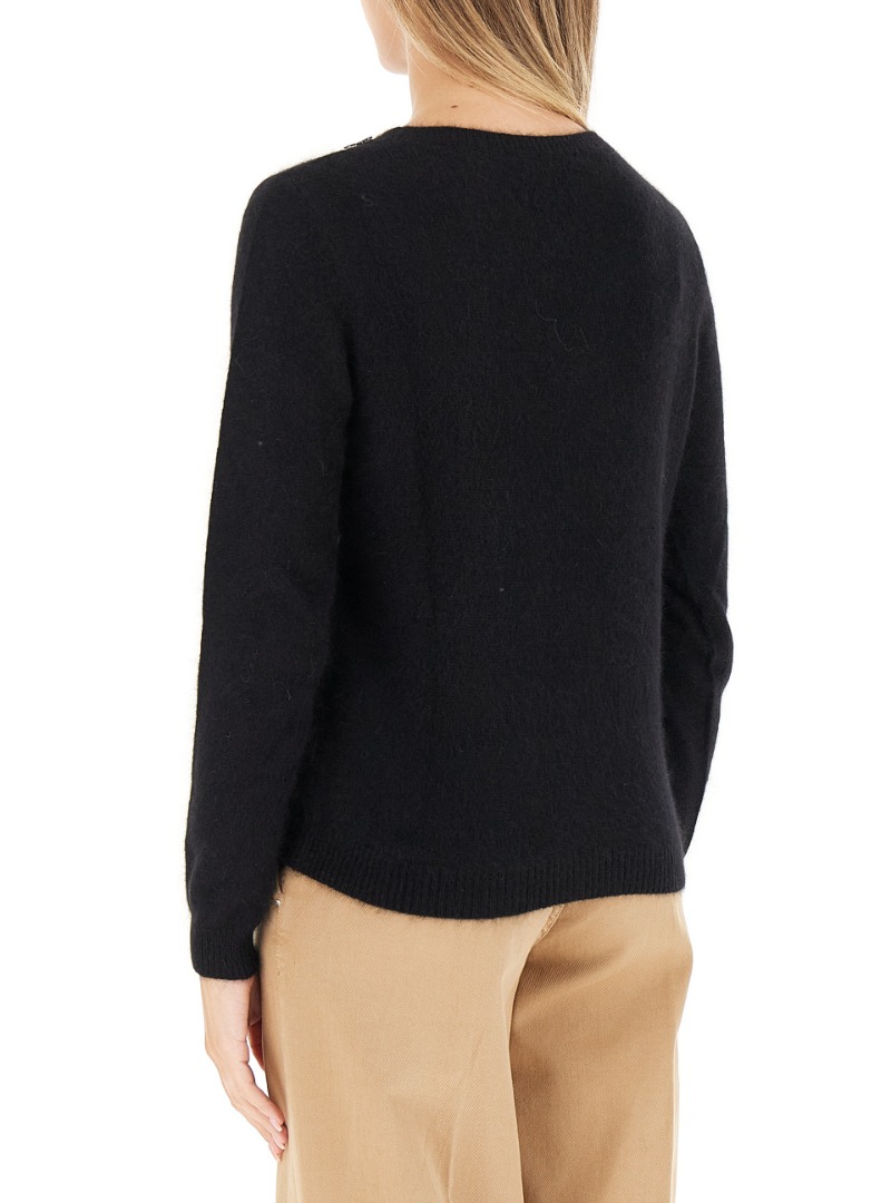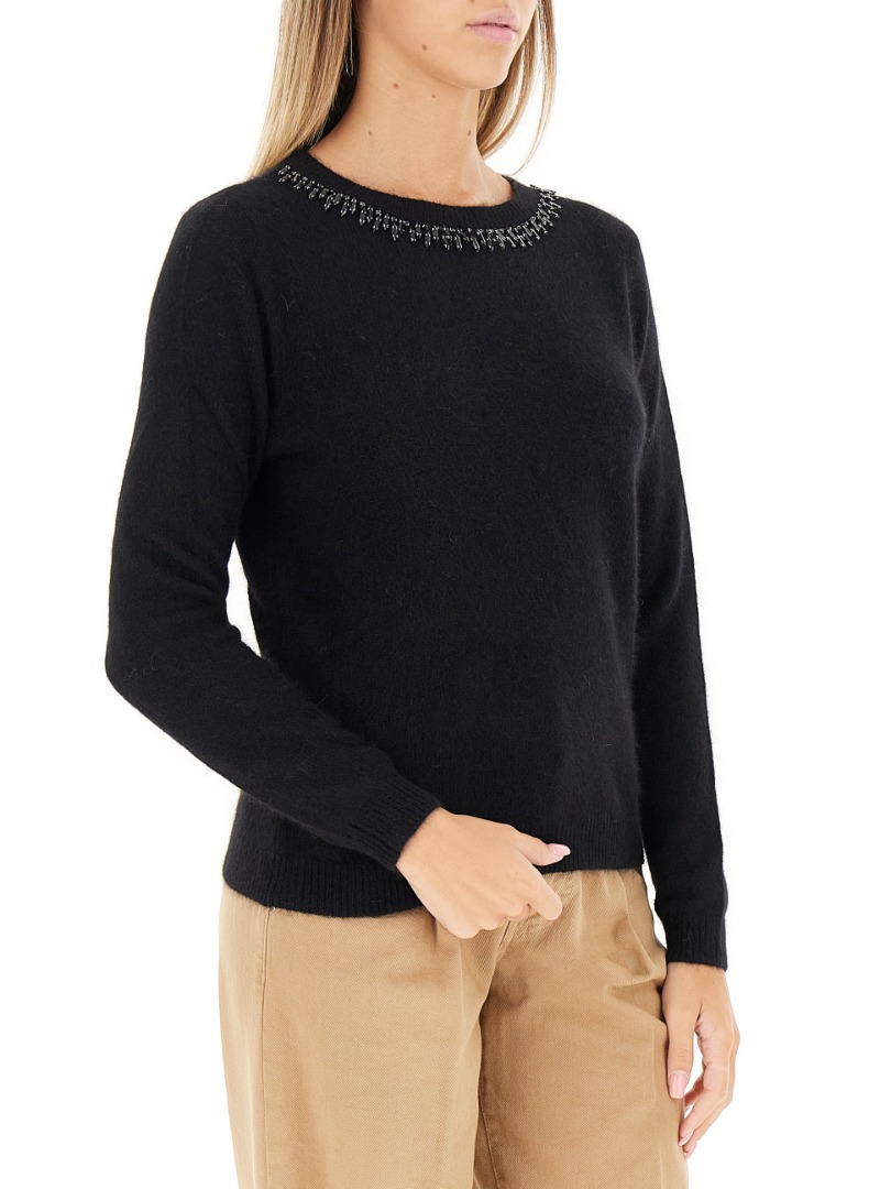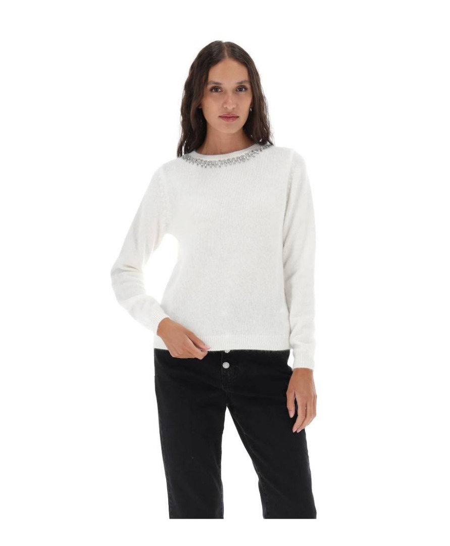 Questa maglia presenta lo scollo impreziosito da un collier in pietre che regala stile e raffinatezza al capo. Il modello presenta taglio dritto, vestibilità regolare e bordi a costine.