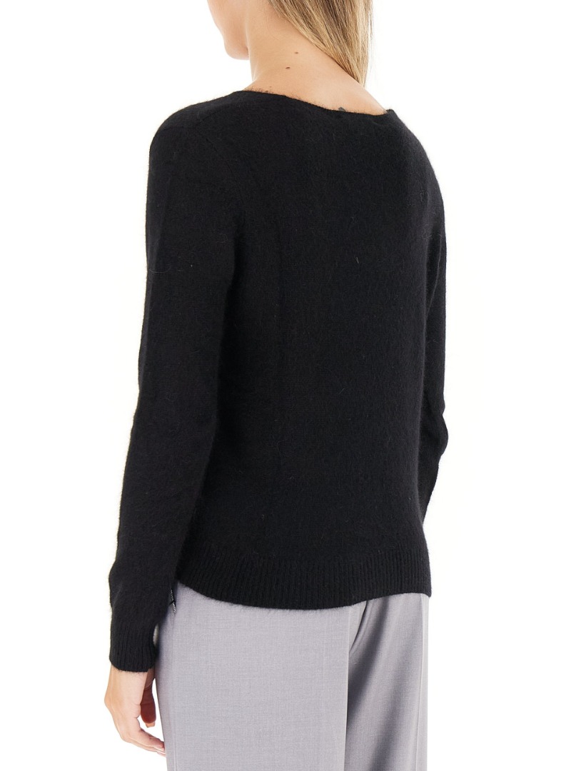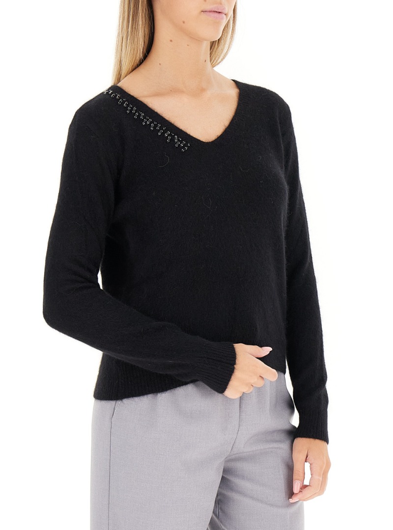Questa maglia, caratterizzata da uno stile minimal e un taglio essenziale, è impreziosita da un delicato dettaglio in pietre sullo scollo a V. Il capo presenta bordi a costine e vestibilità regolare.