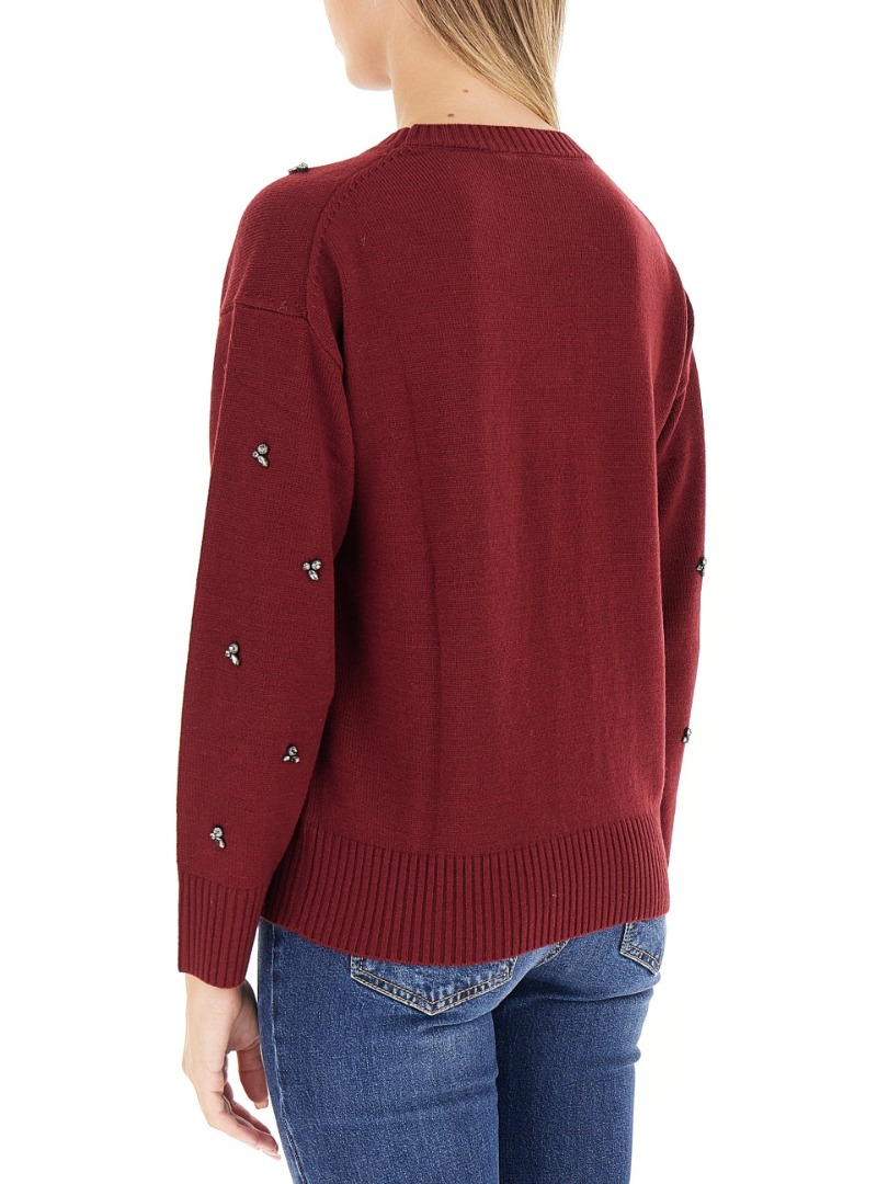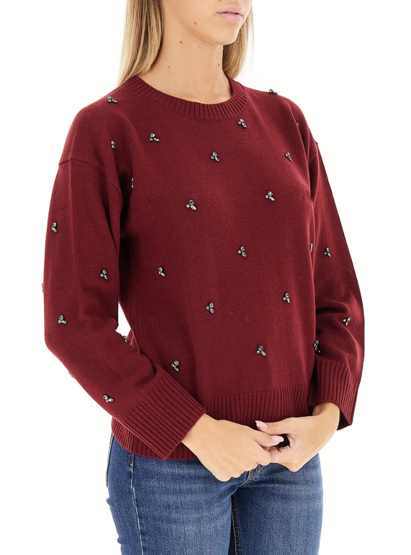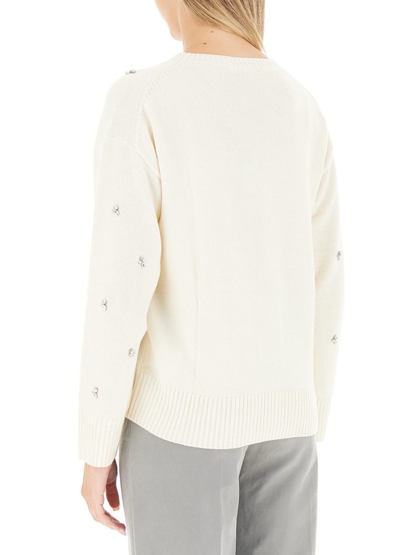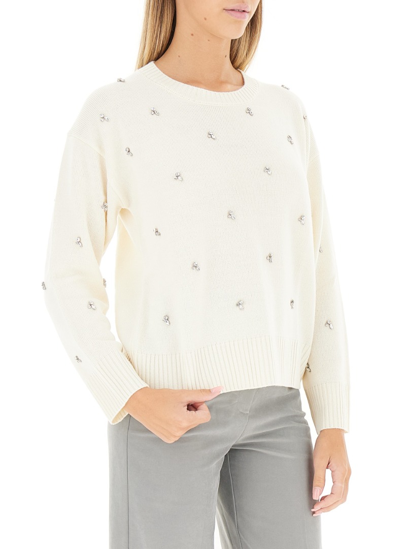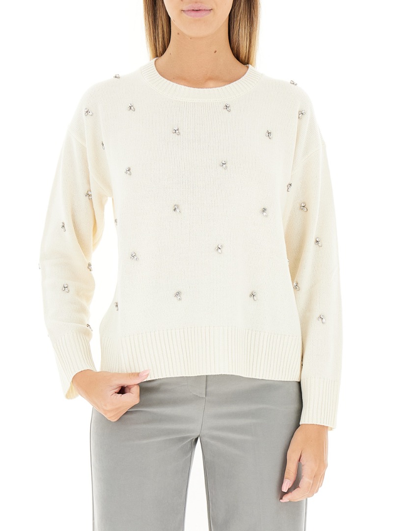 Lo stile classico di questa maglia girocollo è impreziosito da piccoli ricami all over in pietre che regalano al capo un elegante accento glam. Il modello presenta taglio dritto e bordi a costine.