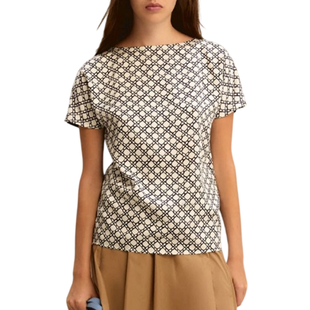 Per un look versatile e quotidiano, ecco la blusa pensata per te: con fronte in tessuto stampato a motivo geometrico, e retro in jersey stretch a contrasto. Tessuto principale contenente una percentuale di poliestere riciclato superiore al 50% Blusa in twill stampato sul davanti e jersey di cotone stretch sul retro Fit regolare Scollo a barchetta Maniche corte