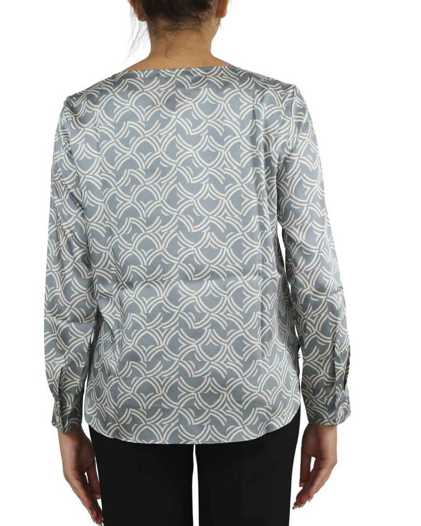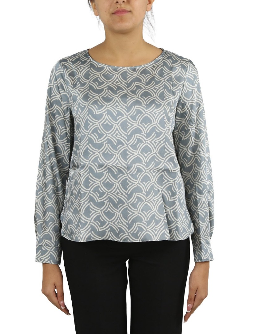 Blusa in twill tecnico stampato dalla linea dritta, luminosa e scivolata. Lo scollo a barchetta e le maniche lunghe con bottone al polso aggiungono un tocco femminile, mentre il fondo stondato e asimmetrico regala movimento ed eleganza discreta. Fit dritto Scollo a barchetta Maniche lunghe con bottone al polso Fondo stondato e asimmetrico con spacchetti laterali