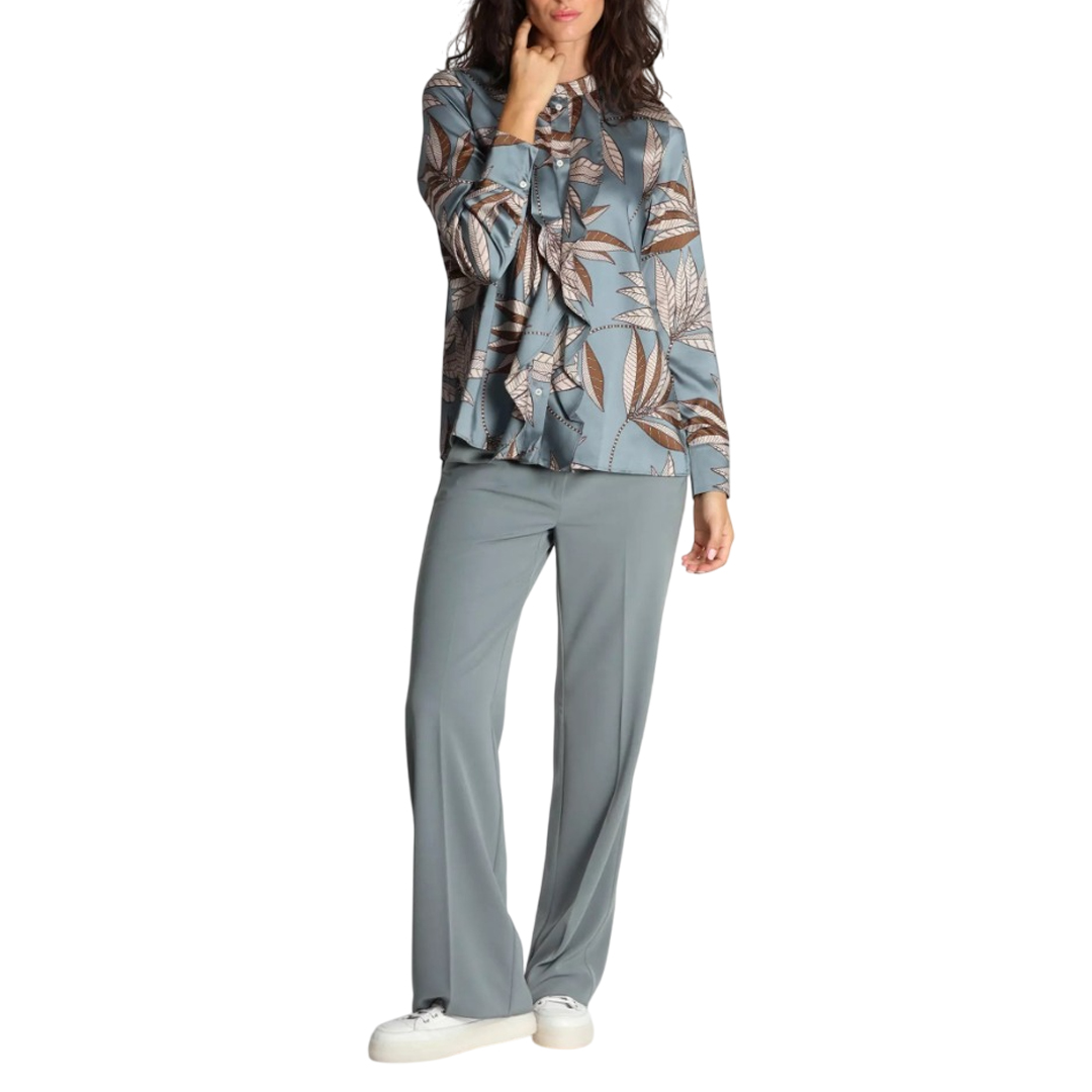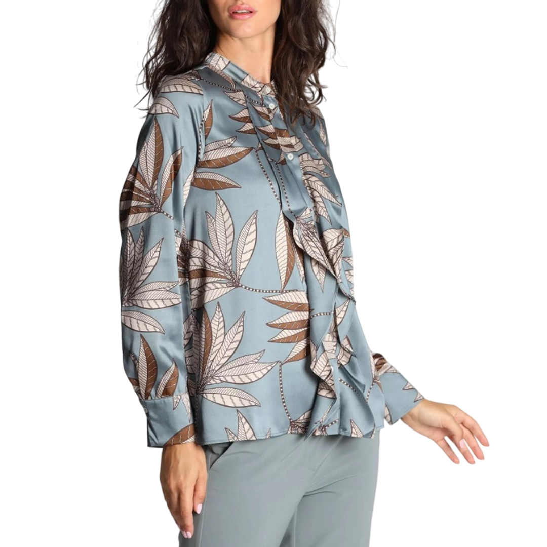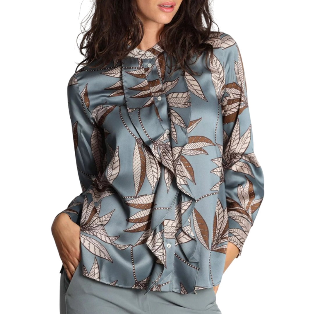 Ampi foliage e il tocco romantico dei volant sul davanti trasformano questa camicia in un nuovo must di stagione. Perfetta sotto un impermeabile e con i denim. Tessuto principale contenente una percentuale di poliestere riciclato superiore al 50% Camicia in tessuto tecnico stampato Fit dritto Collo alla coreana con abbottonatura a vista Motivo di piccoli volant sul davanti Polso con bottone e piccolo sbuffo