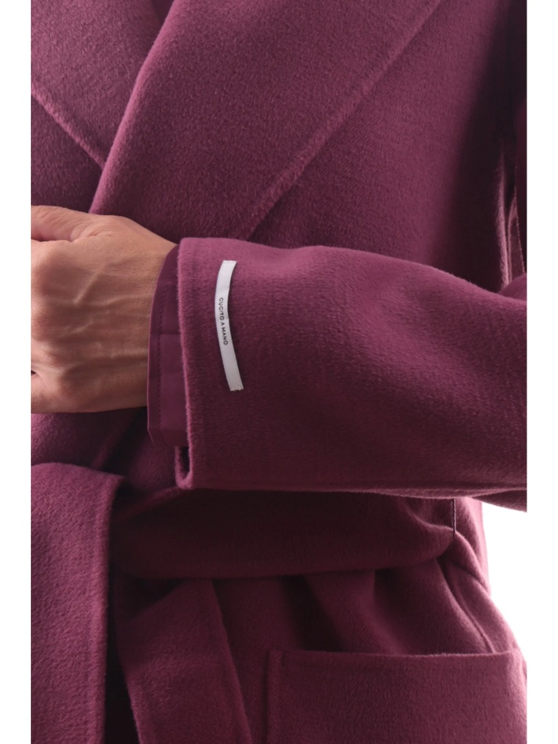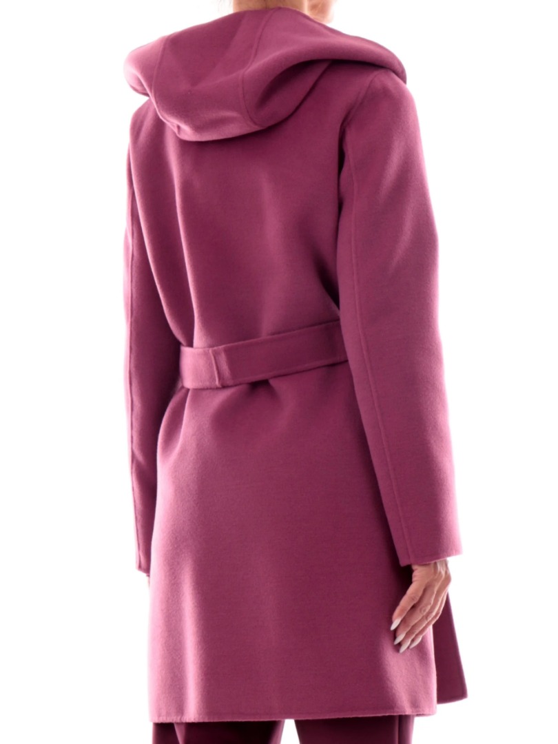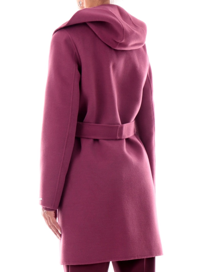 Cappotto in tessuto double, fit morbido, collo a scialle, con cappuccio, chiusura a vestaglia con cintura, tasche applicate.