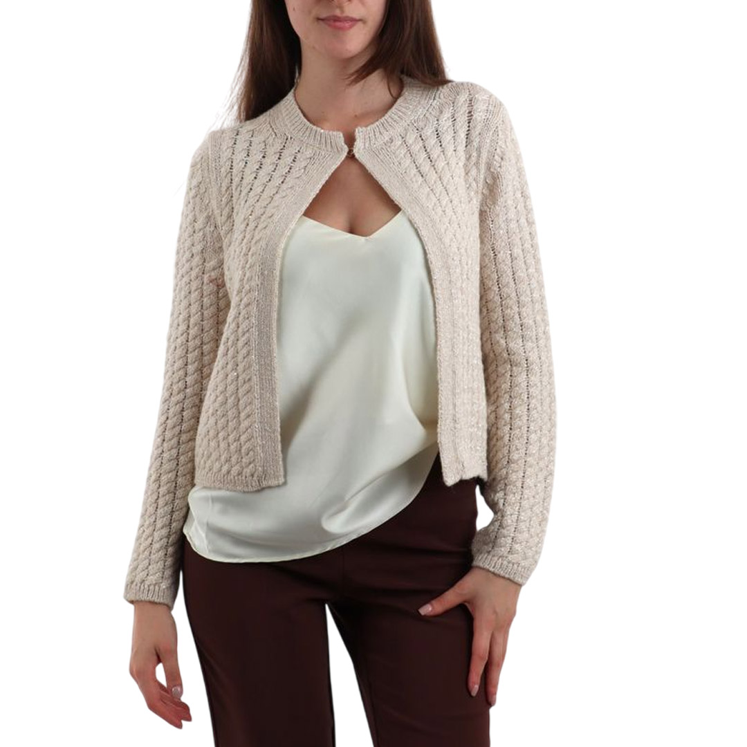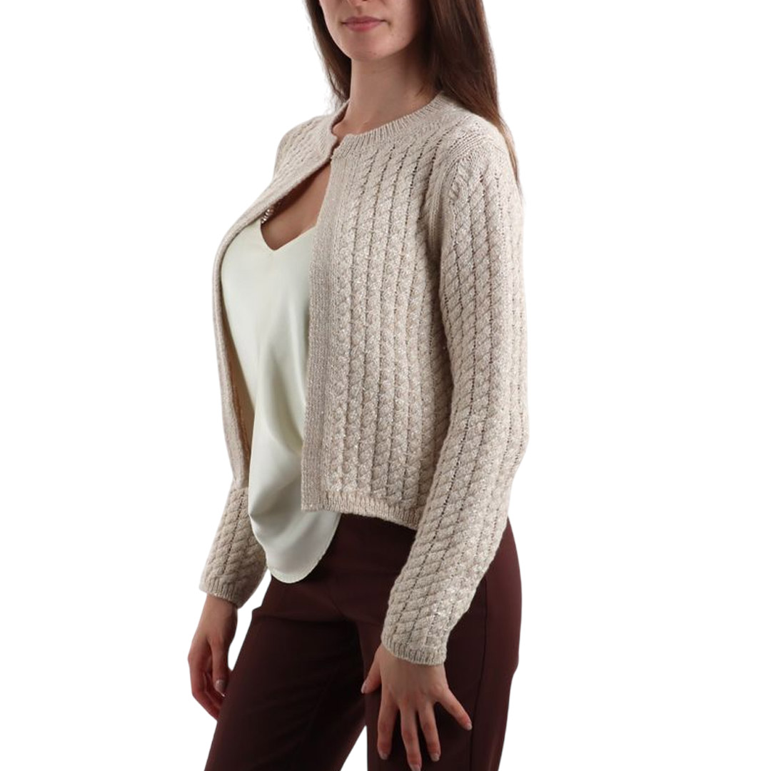 Cardigan in maglia di misto viscosa, lana e cashmere con paillette. Fit dritto, scollo stondato, chiusura con uncino dorato, bordi rifiniti con costine
