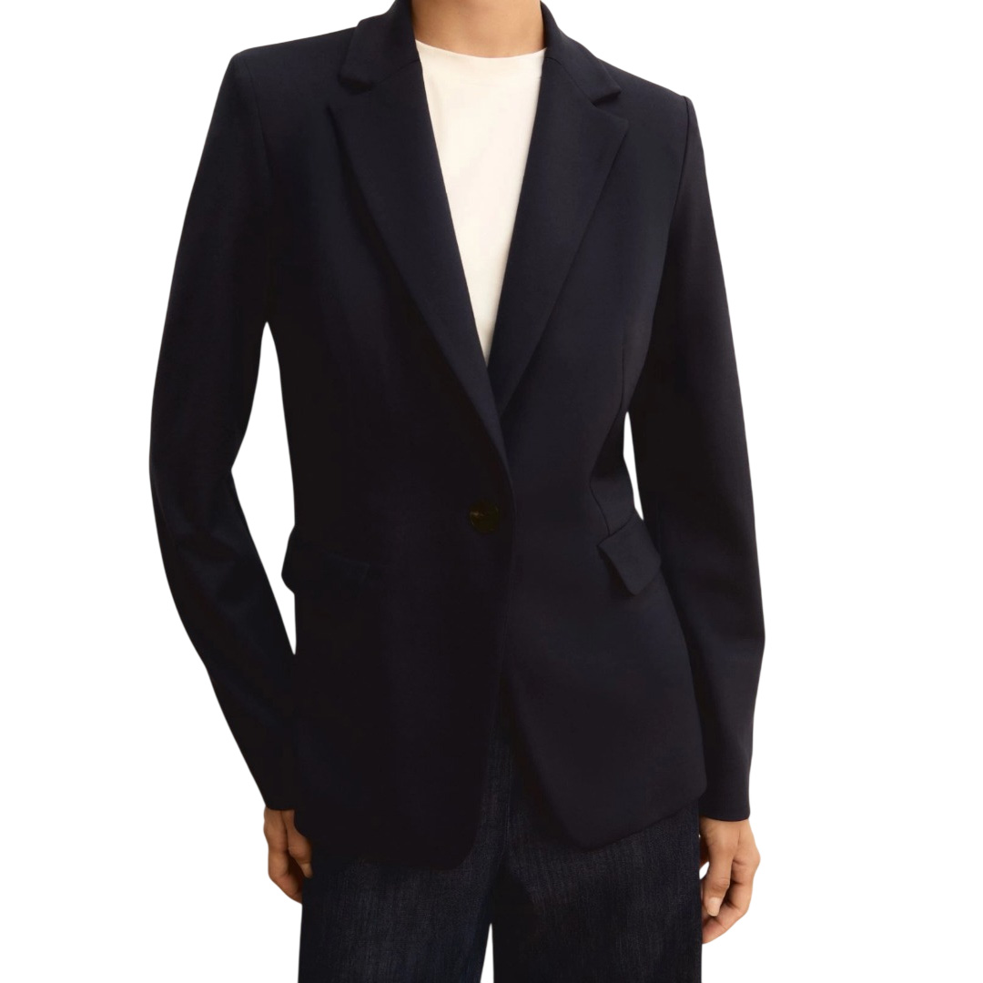 Nuovo blazer in jersey stretch, in connubio perfetto tra silhouette sartoriale definita e comfort totale. Monopetto, con rever e pince profonde che segnano i fianchi. Blazer in jersey stretch parzialmente foderato Fit aderente Scollo con rever Chiusura monopetto con bottone a vista Tasche laterali con patta Pince profonde e fianchetti sagomati