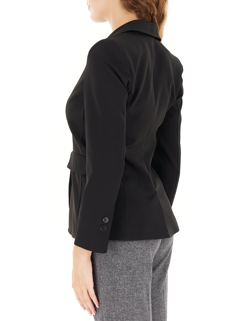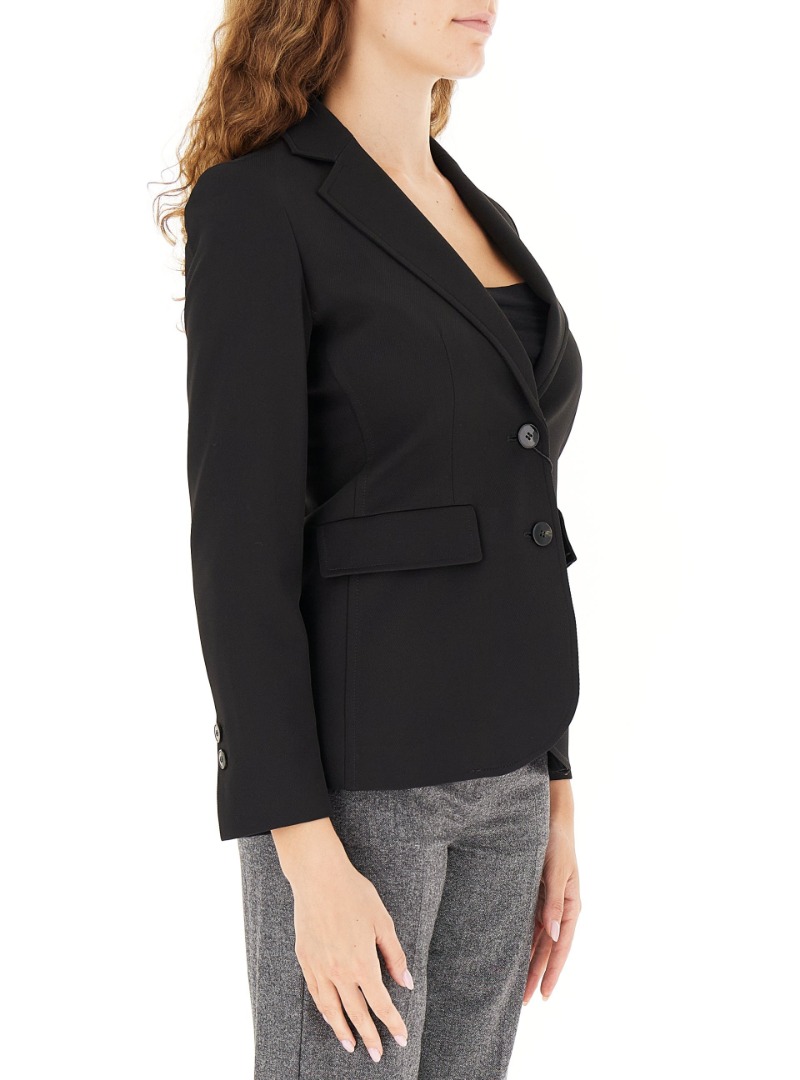 Blazer a due bottoni in tessuto diagonale stretch con scollo a rever. Tasche laterali con patta e cuciture sui fianchi a rilievo. Spacco centrale sul fondo posteriore