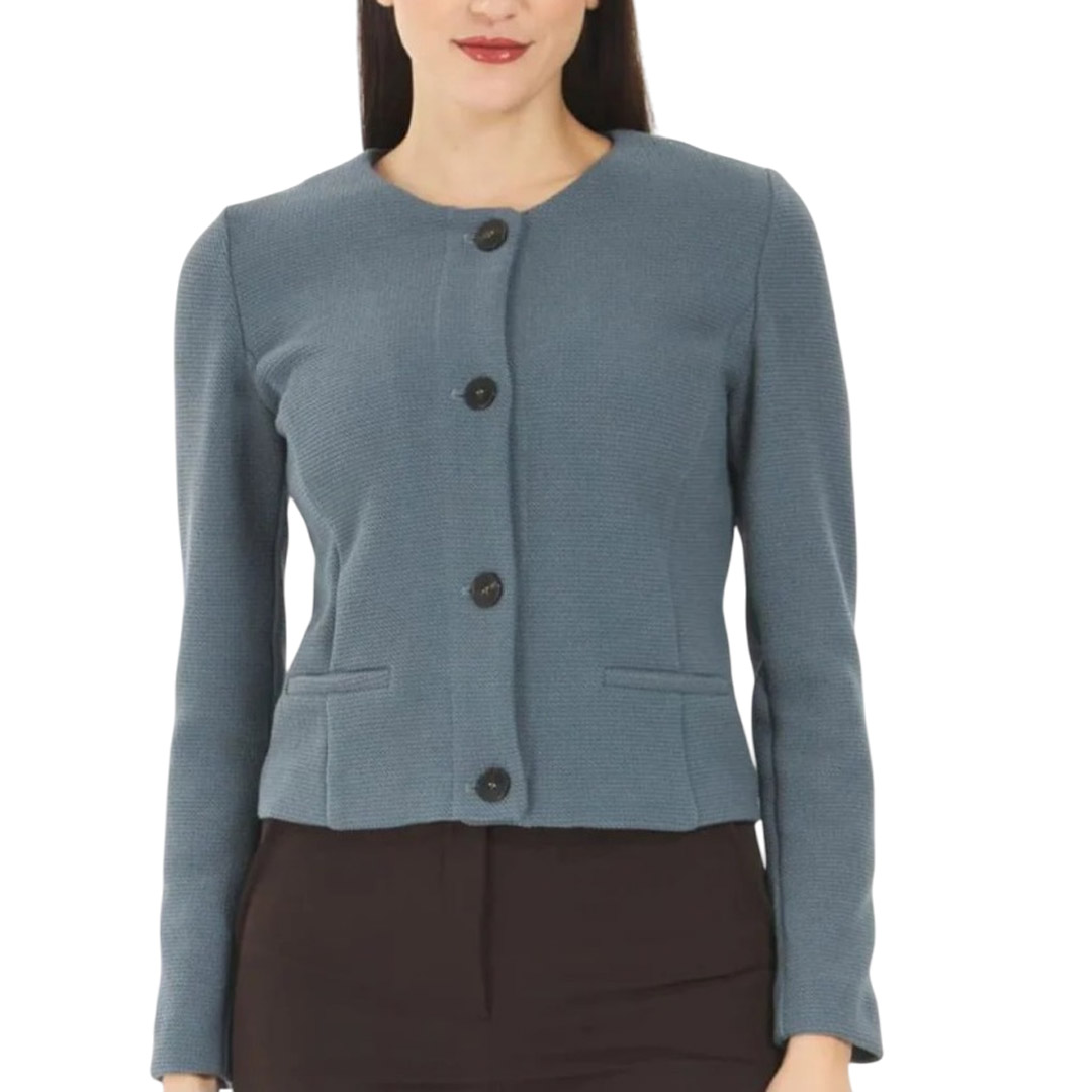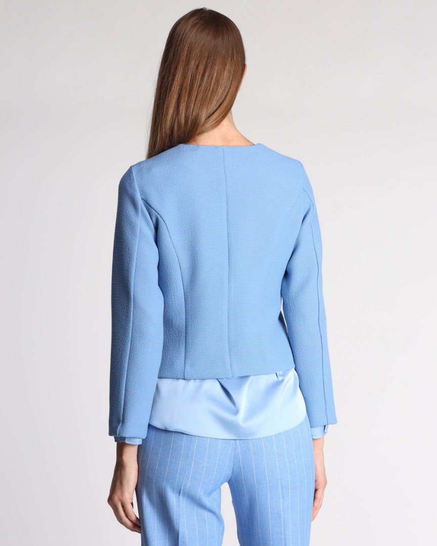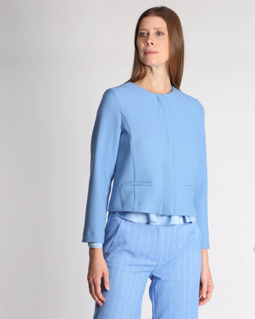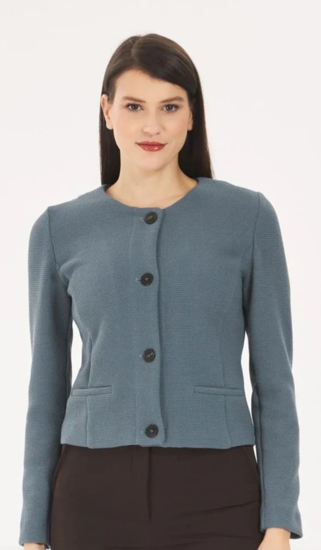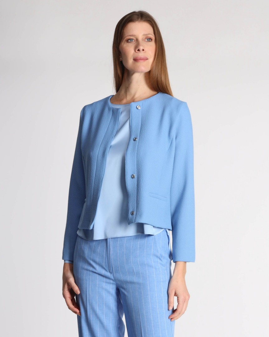 Giacca corta in stuoia armaturata di misto viscosa stretch, Fit femminile con linea sfiancata, collo stondato, chiusura con bottoni a vista effetto corno. Tasche orizzontali a filetto, capo foderato.
