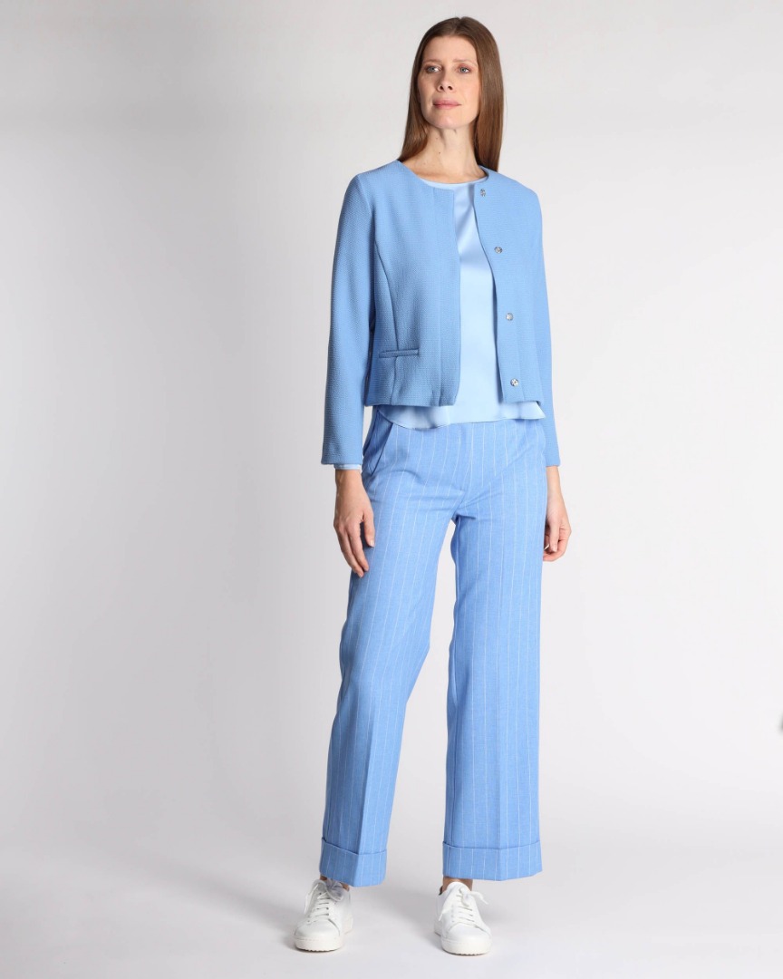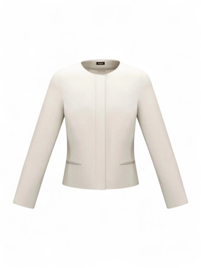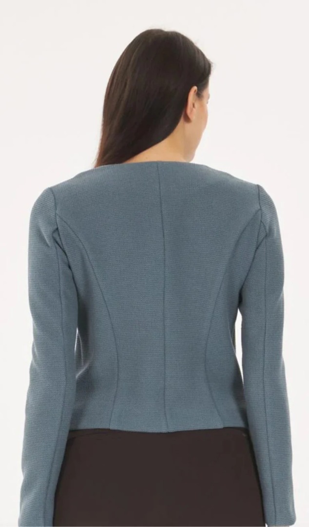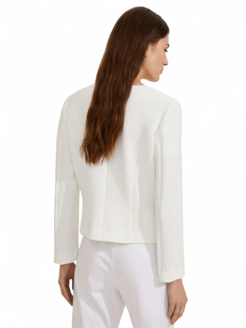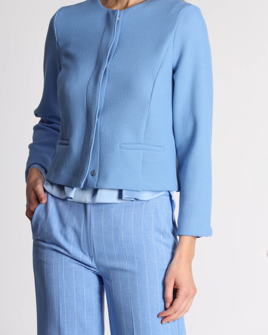Giacca corta in stuoia armaturata di misto viscosa stretch, Fit femminile con linea sfiancata, collo stondato, chiusura con bottoni a vista effetto corno. Tasche orizzontali a filetto, capo foderato.