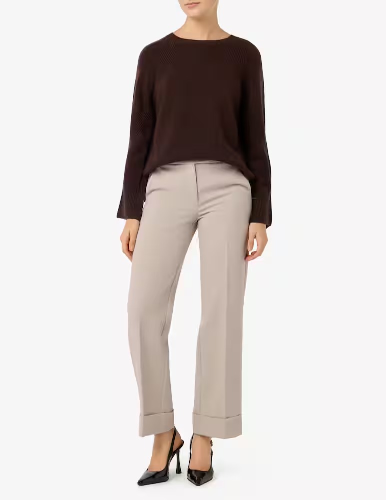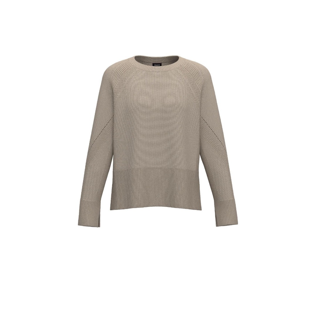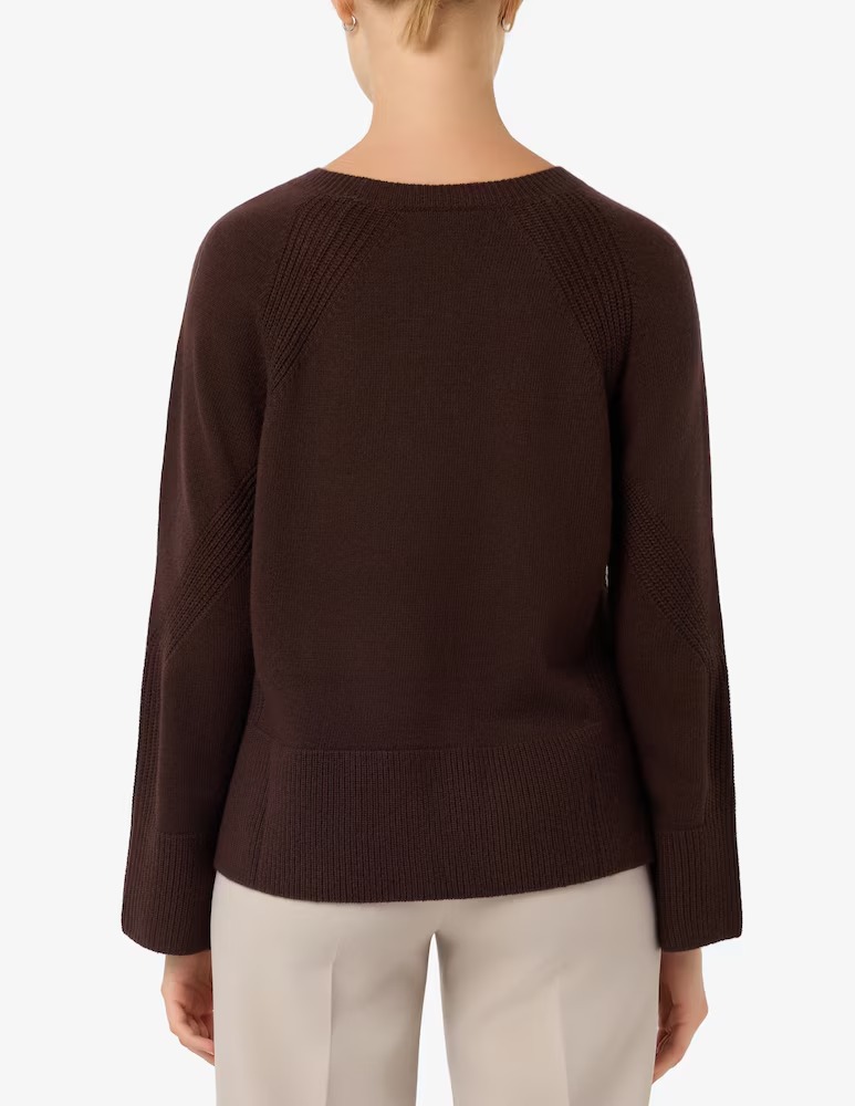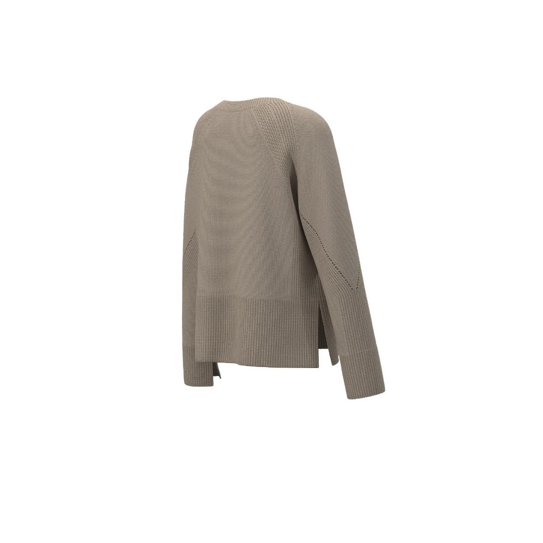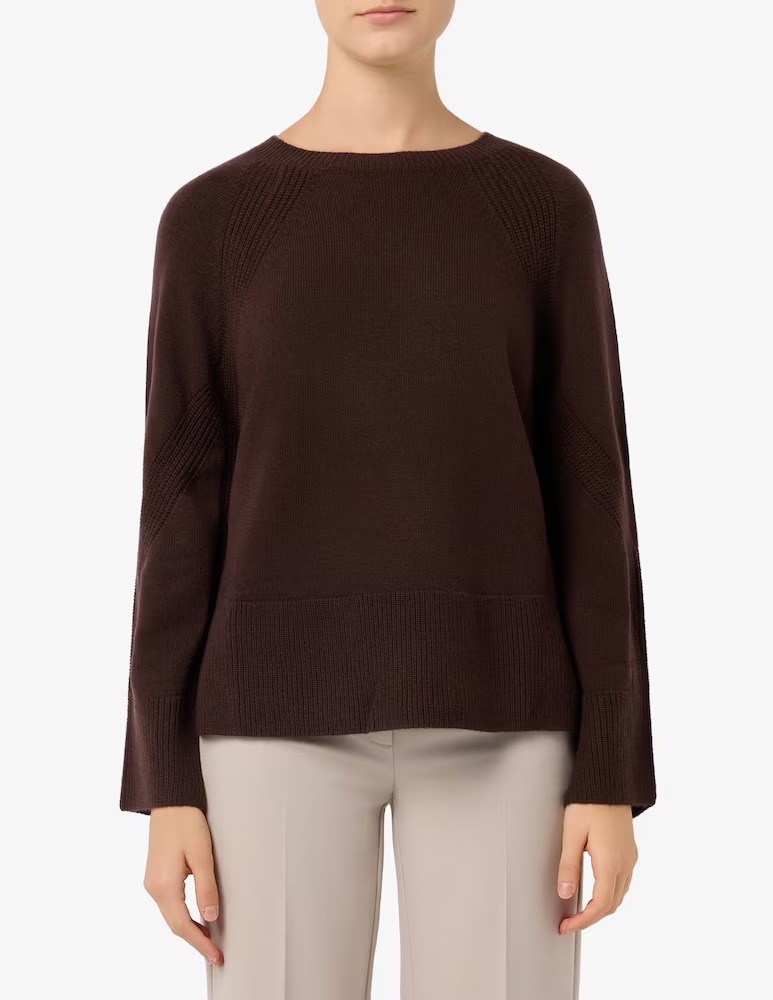 Calda e cocoon, la maglia in misto lana gioca con un fit dritto sul busto e gli spacchi laterali. Il gioco di calature e di punti a contrasto aggiunge dinamicità e una nota informale al design. Maglia in filato di misto lana, fit dritto, scollo stondato, manica raglan con dettaglio di calature, fondo con spacchi laterali e dettaglio a punto pannocchia