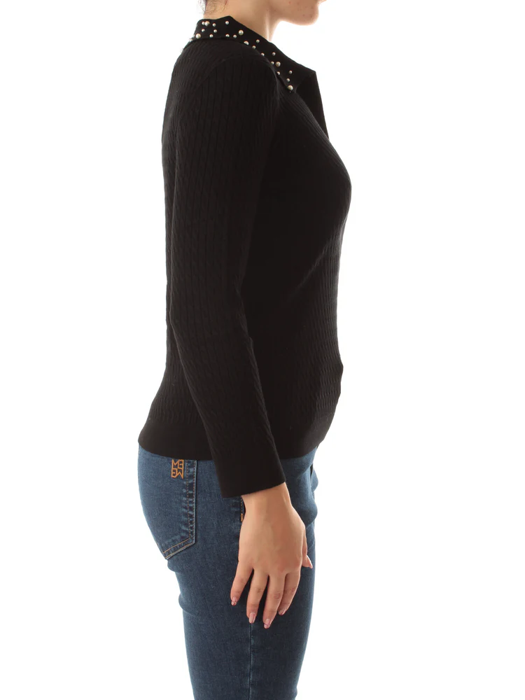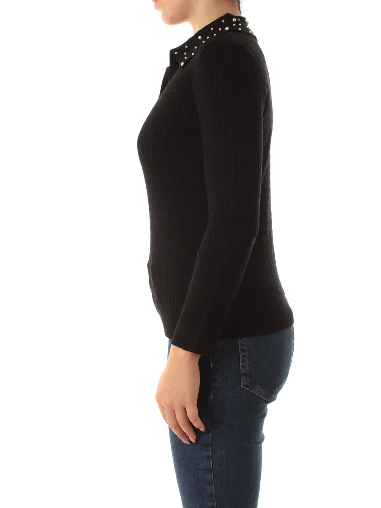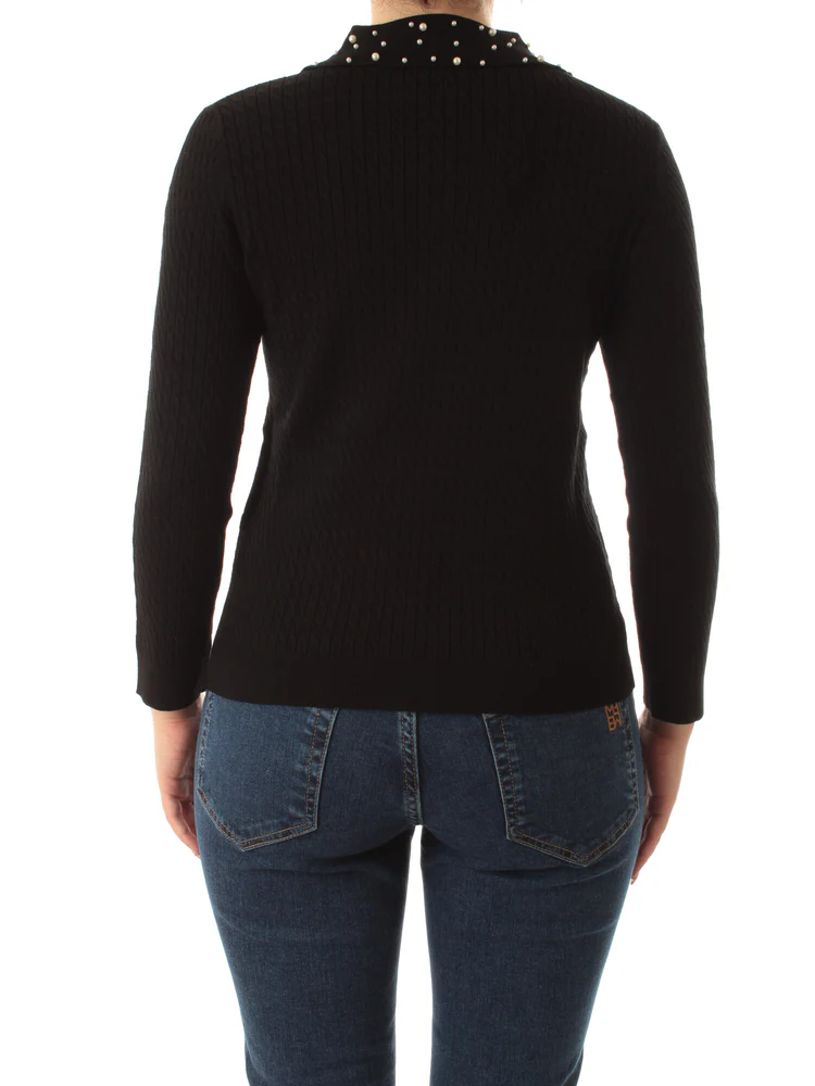 Maglia a polo in filato rasato con lavorazione a trecce. Maniche lunghe e perline applicate sul colletto