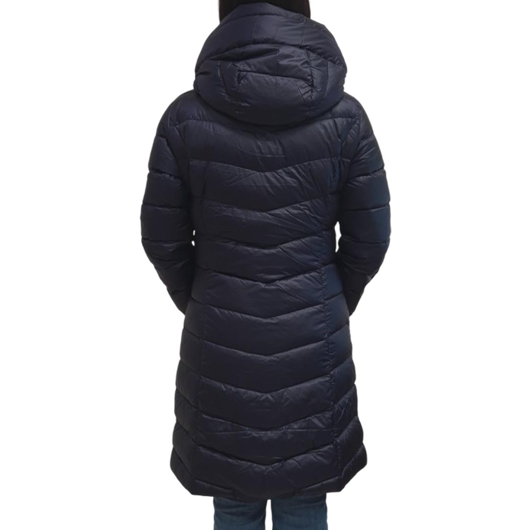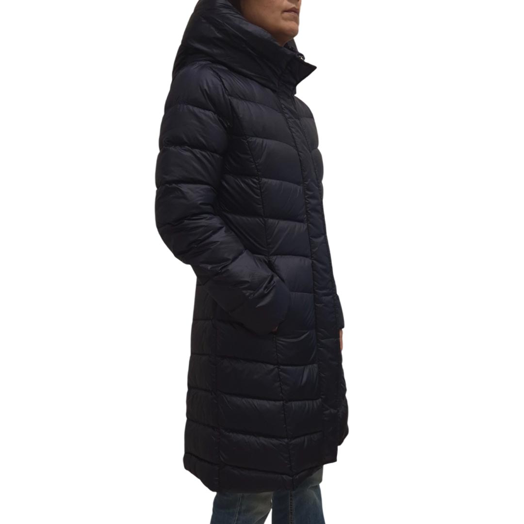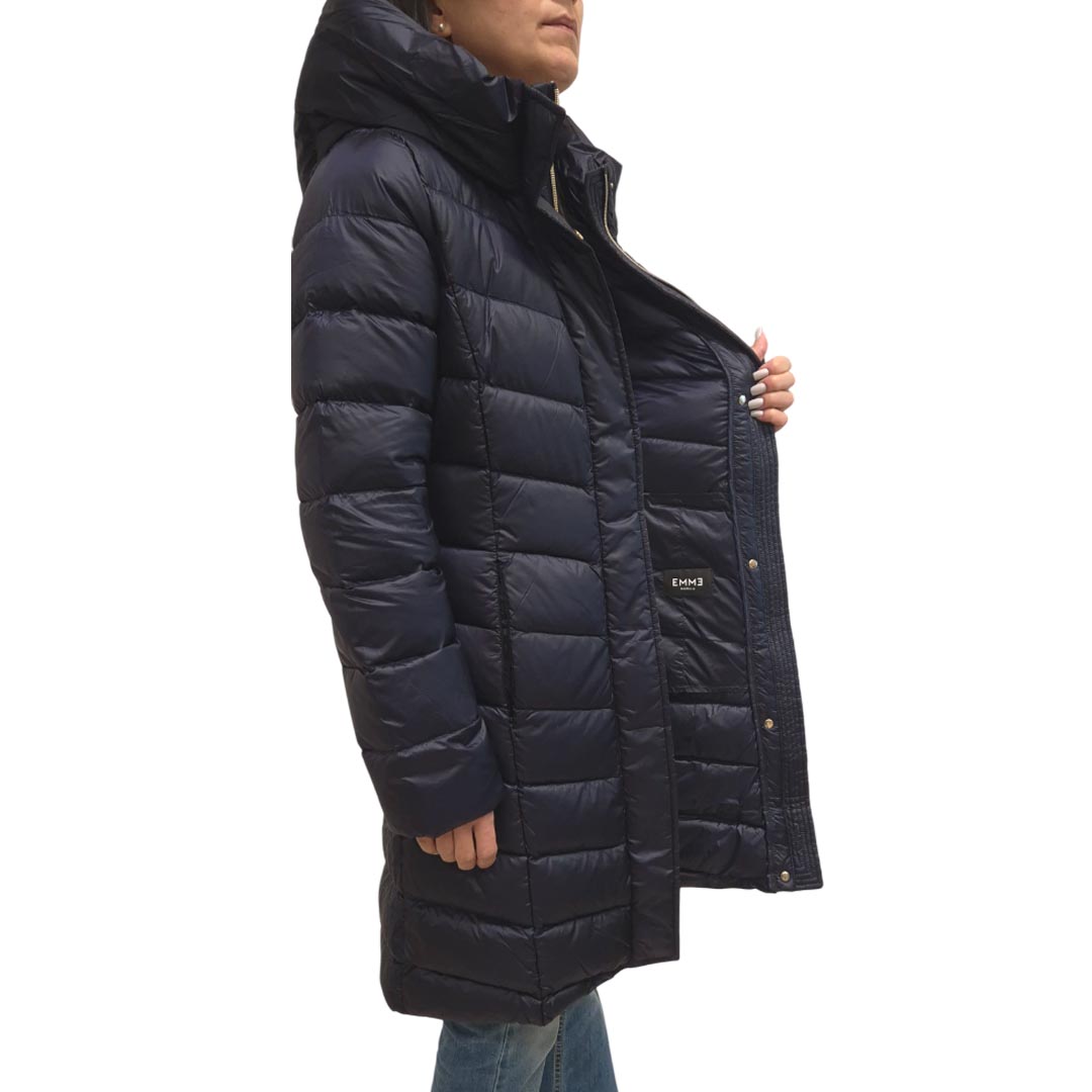 Piumino blu in tela antigoccia, collo alto con cappuccio, maniche lunghe, chiusura con zip e bottoni automatici nascosti, linea dritta, tasche a filetto con zip invisibile, imbottitura in piumino