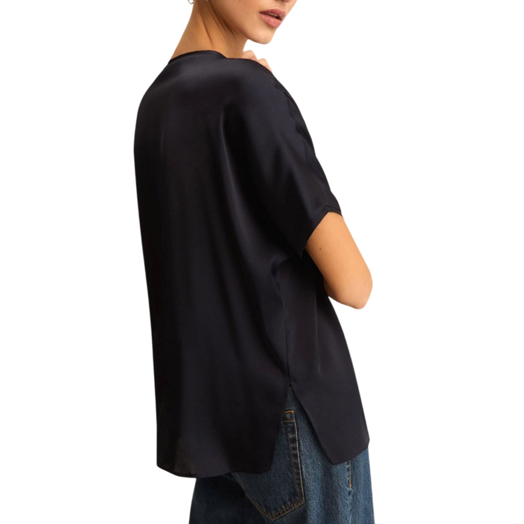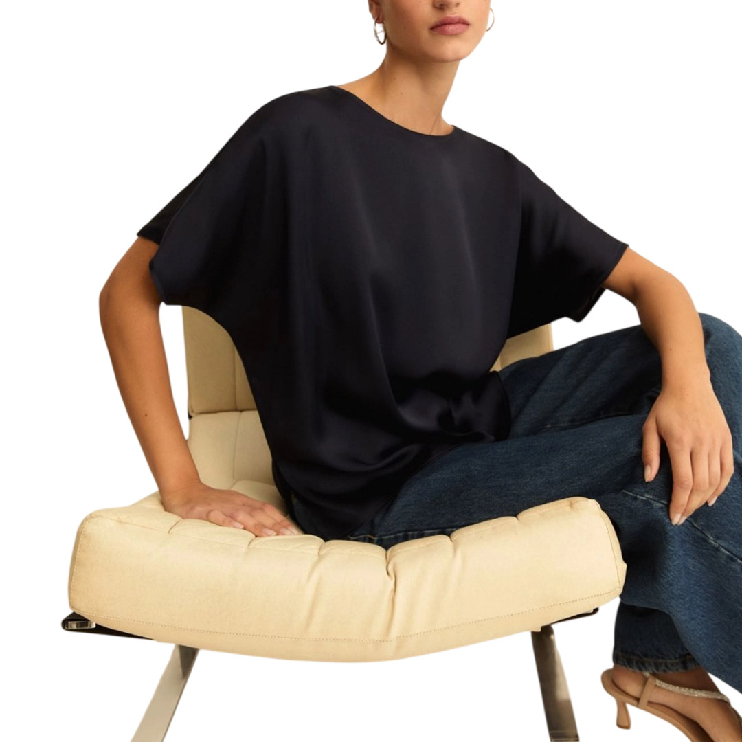 L'eleganza del raso, le linee cool della t-shirt: impossibile resistere alla versatilità di questo nuovo top, con maniche a kimono e dettagli di bordi a vivo. T-shirt in raso Fit ampio Scollo a barchetta Manica corta con linea a kimono con bordi tagliati a vivo Spacchi lungo i fianchi