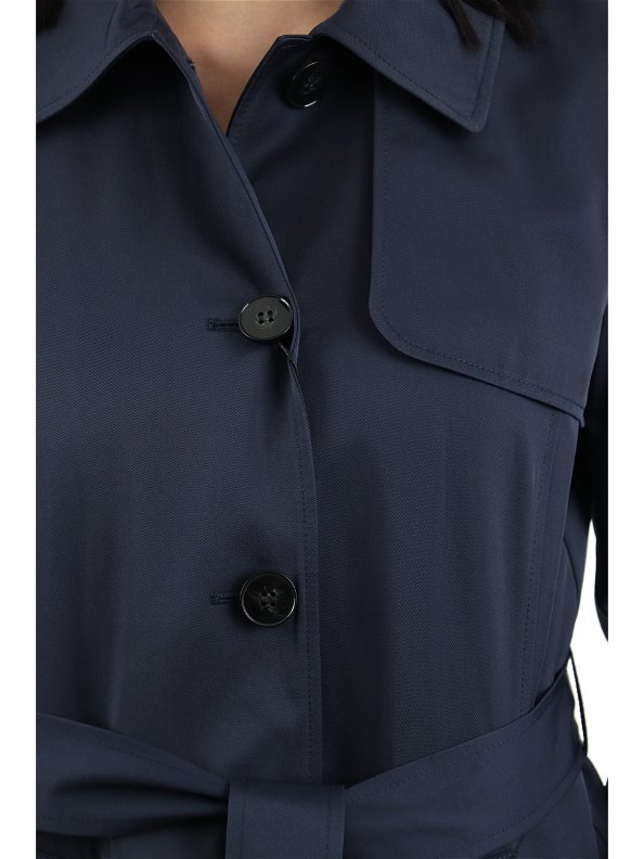 Trench realizzato in gabardine antigoccia caratterizzato da bavolette e impunture. La cintura coordinata delinea la silhouette e lo spacco sul retro lo rende più comodo. Trench in gabardine antigoccia Linea dritta con bavolette e cintura Collo a camicia, maniche lunghe con alamari sul fondo Chiusura con bottoni a vista Tasche a filetto