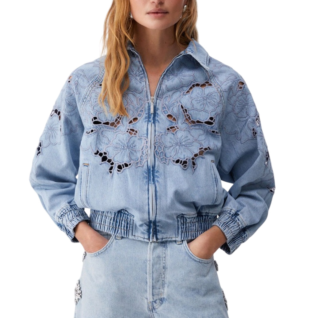 I ricami traforati floreali donano carattere al fit morbido di questo bomber, perfetto alleato della mezza stagione. Sceglilo su pantaloni ton sur ton o sui maxi abiti in raso al prossimo pranzo con le amiche. Giacca modello bomber Ricami traforati Comode tasche Chiusura con zip Polsini e orlo elasticizzati
