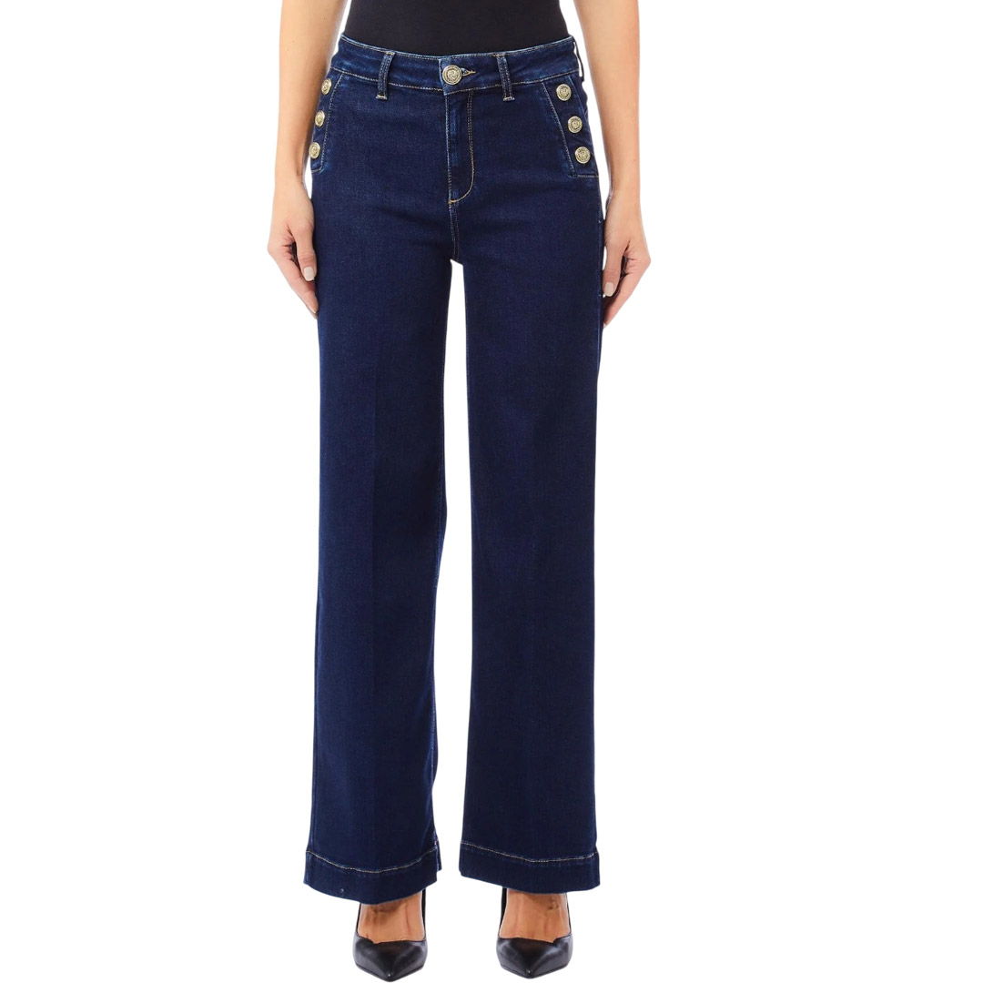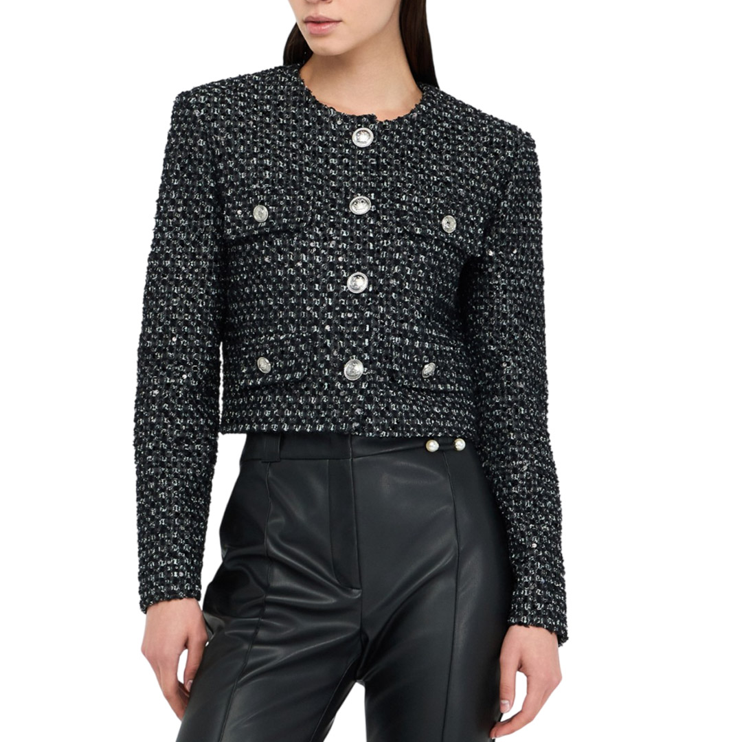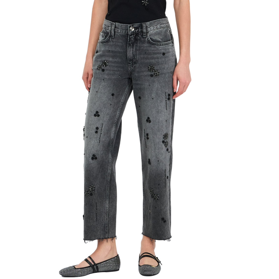 Giacca in denim di cotone Lavaggio used Strass applicati Collo a camicia Taschini con patta e bottone Tasche sui lati Maniche lunghe Polsi con bottone Orlo sfrangiato Patch logata sul retro Chiusura con bottoni