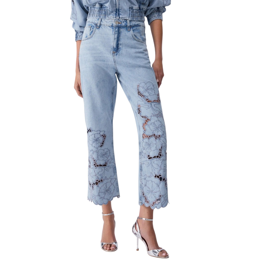 Il denim chiaro e i ricami traforati rendono questo jeans straight il perfetto alleato dei look da città: di giorno con camicie e ballerine, la sera con top e sandali stiletto. Jeans in denim in cotone Lavaggio used Vita alta Gamba dritta Ricami traforati Comode tasche Chiusura con zip e bottone Lunghezza gamba: 68 cm Larghezza fondo gamba: 25 cm