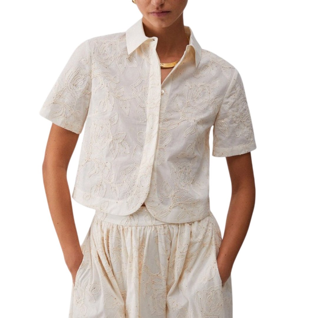 Camicia bianca in mussola di cotone Ricamo floreale raffinato Colletto classico Chiusura frontale con bottoni nascosti Micro paillettes