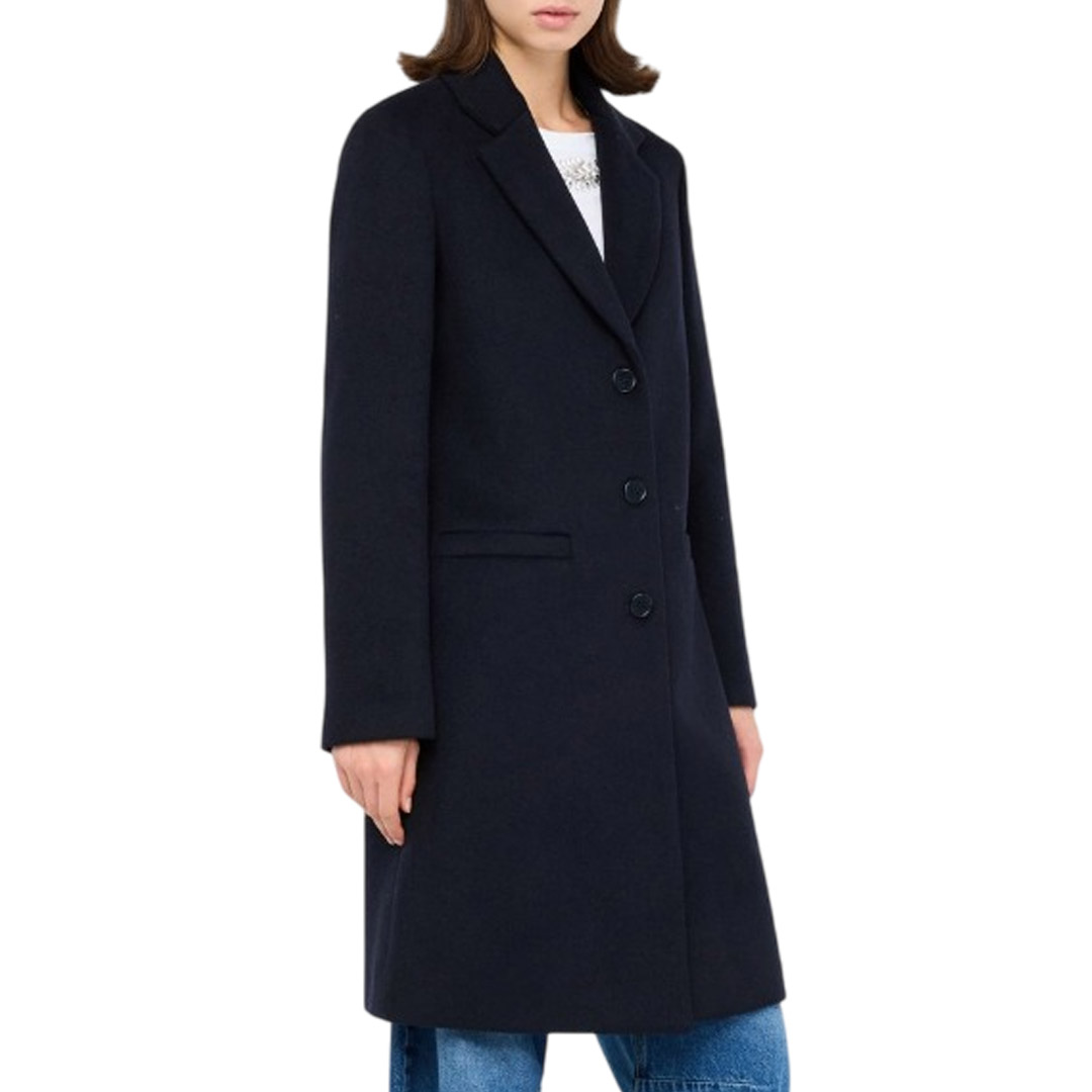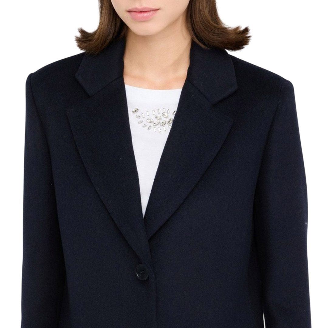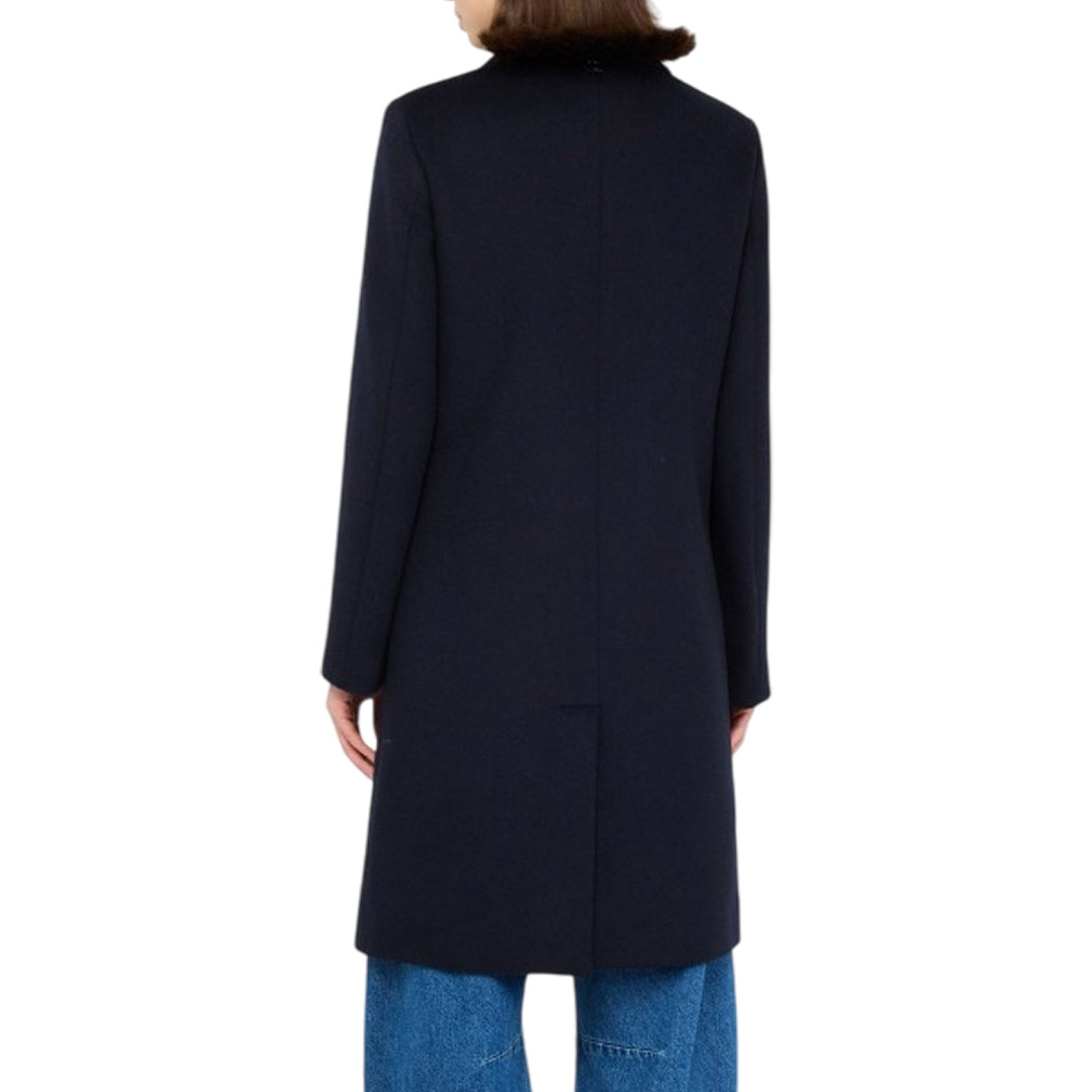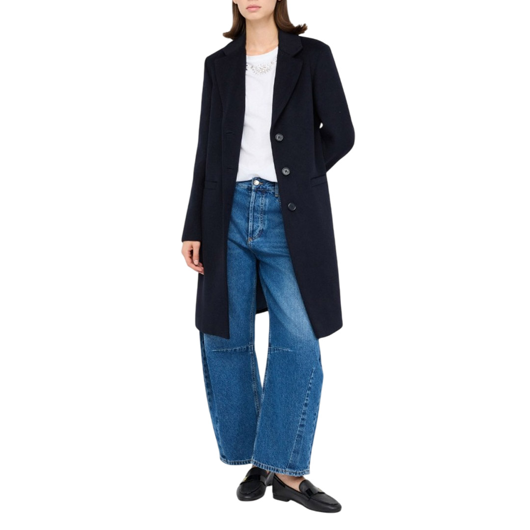 Cappotto blu scuro in lana Rever classico Tasche a filetto Spacchetto sul dietro Chiusura monopetto a tre bottoni