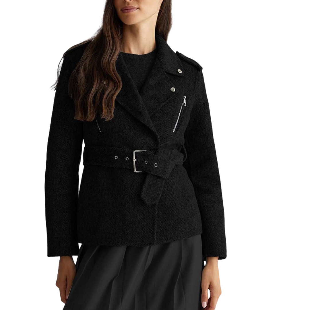Giacca biker in panno di misto lana Collo a revers Mostrine sulle spalle Taschini con zip sui lati Cintura sur ton con fibbia regolabile in abbinamento Chiusura nascosta con bottoni a pressione Fodera interna