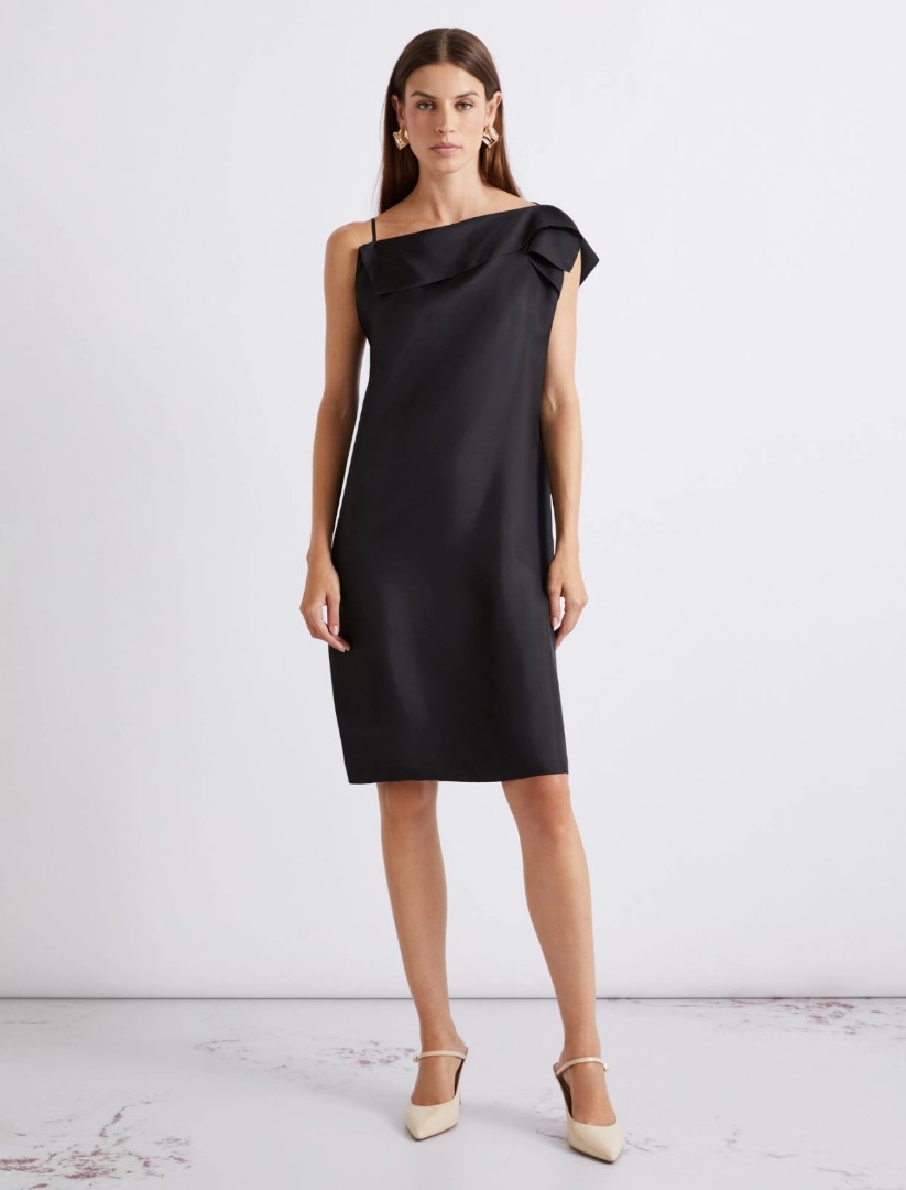 Con lo scollo asimmetrico e il gioco di pannello ripiegato, questo abito aggiunge un dettaglio raffinato al tuo guardaroba. Perfetto per le giornate in ufficio, elegante per le occasioni speciali. Abito in twill di pura seta Fit regolare Linea scivolata sul busto Scollo asimmetrico con lembo ripiegato Spallini sottili