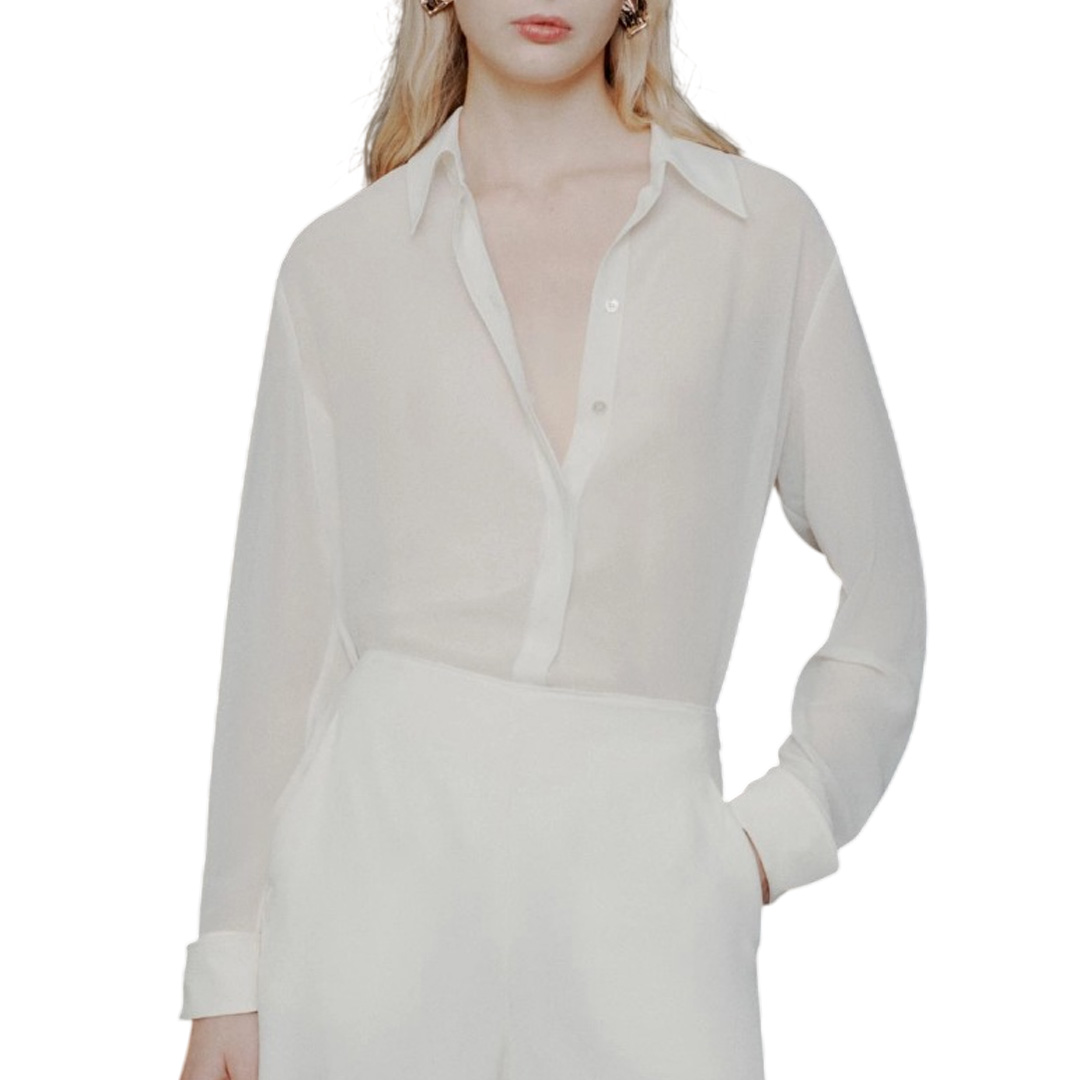 Evoluzione contemporanea della classica camicia maschile, proposta in georgette per un'eleganza che attraversa le stagioni. Linee essenziali accesi dal gemello bijoux al polso, nota brillante al design. Tessuto principale contenente una percentuale di poliestere riciclato superiore al 50% Camicia in georgette crêpe Fit regolare Collo a camicia Abbottonatura nascosta e carré posteriore Polso rigirati con gemello bijoux personalizzato