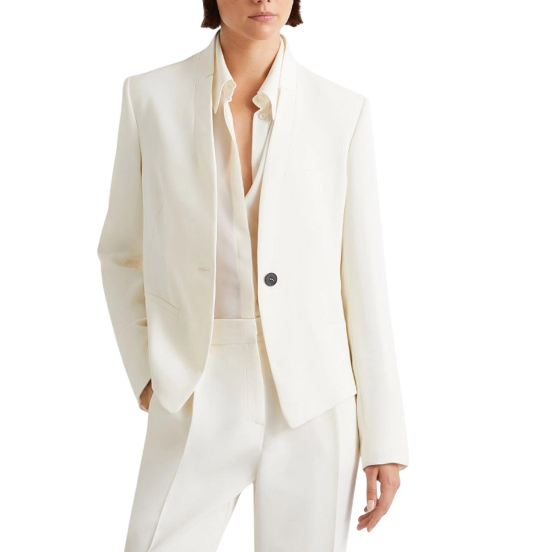 Linee femminili e taglio corto trasformano questo blazer in alleato di stile. Da accompagnare a shorts e tacchi alti per un business look assertivo. Tessuto principale contenente una percentuale di poliestere riciclato superiore al 50% Blazer in crêpe envers satin e satin Fit aderente Scollo rialzato Chiusura monopetto con bottone a vista Tasche a filetto