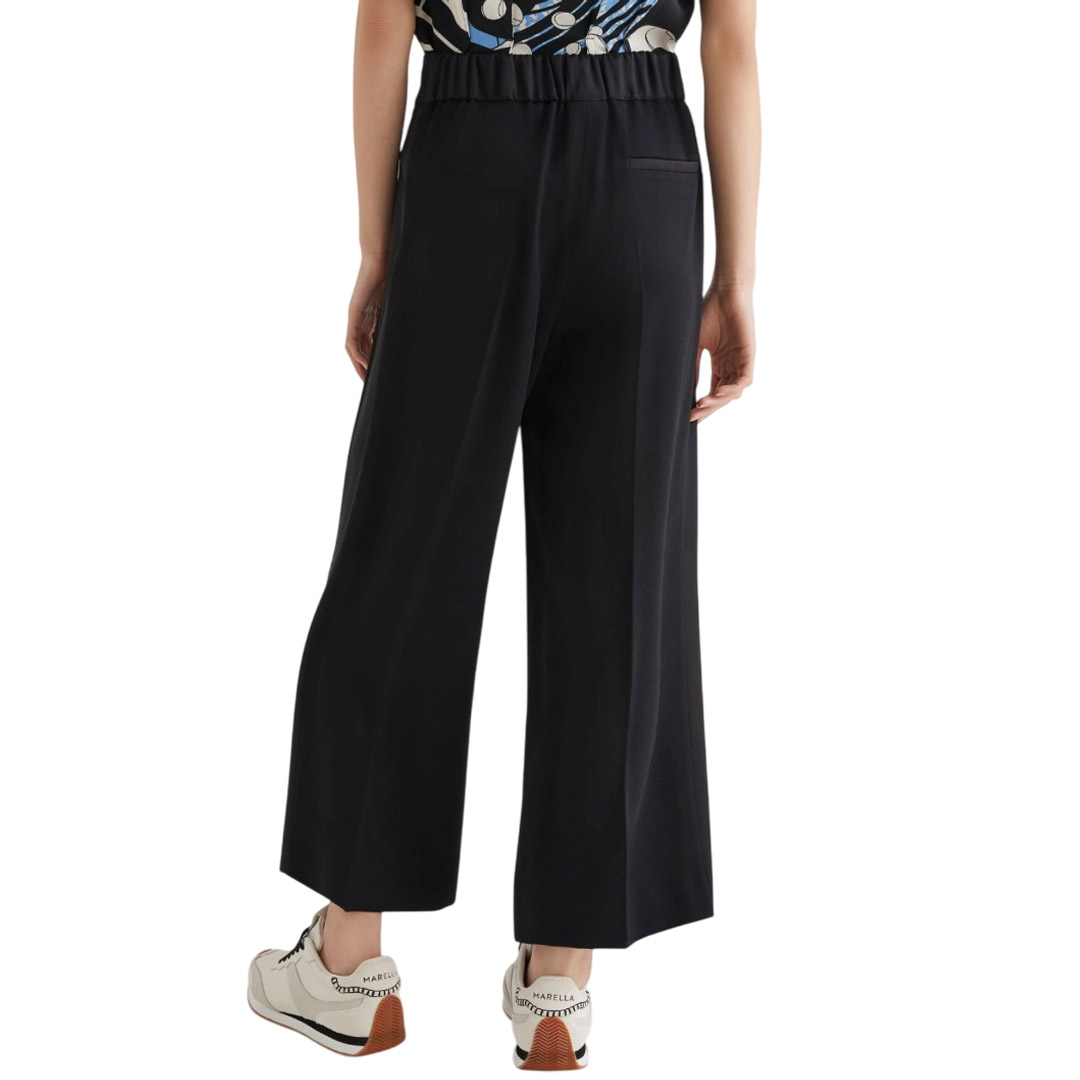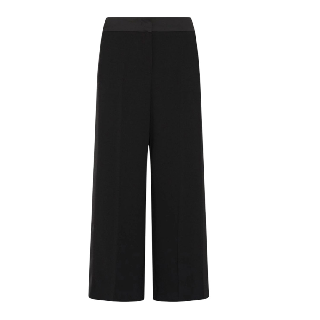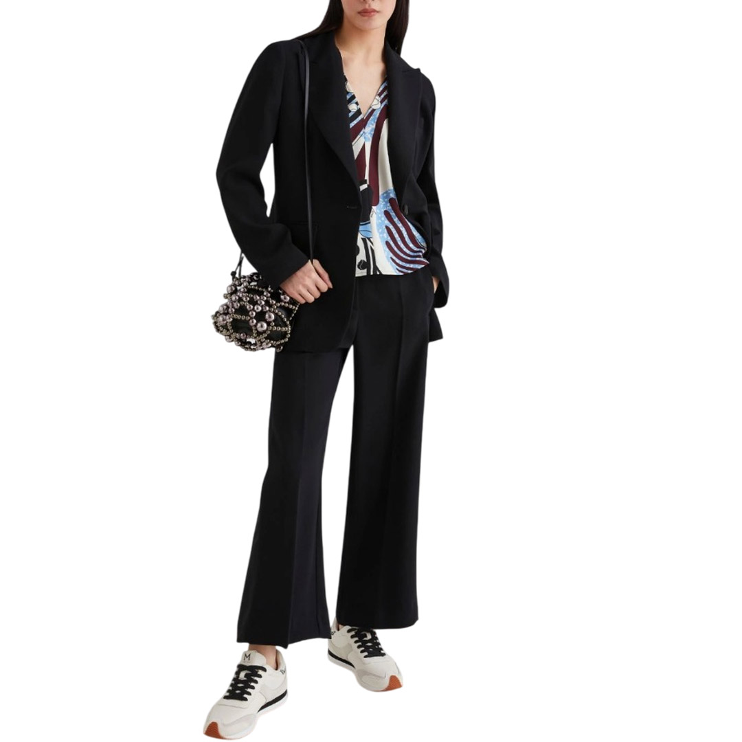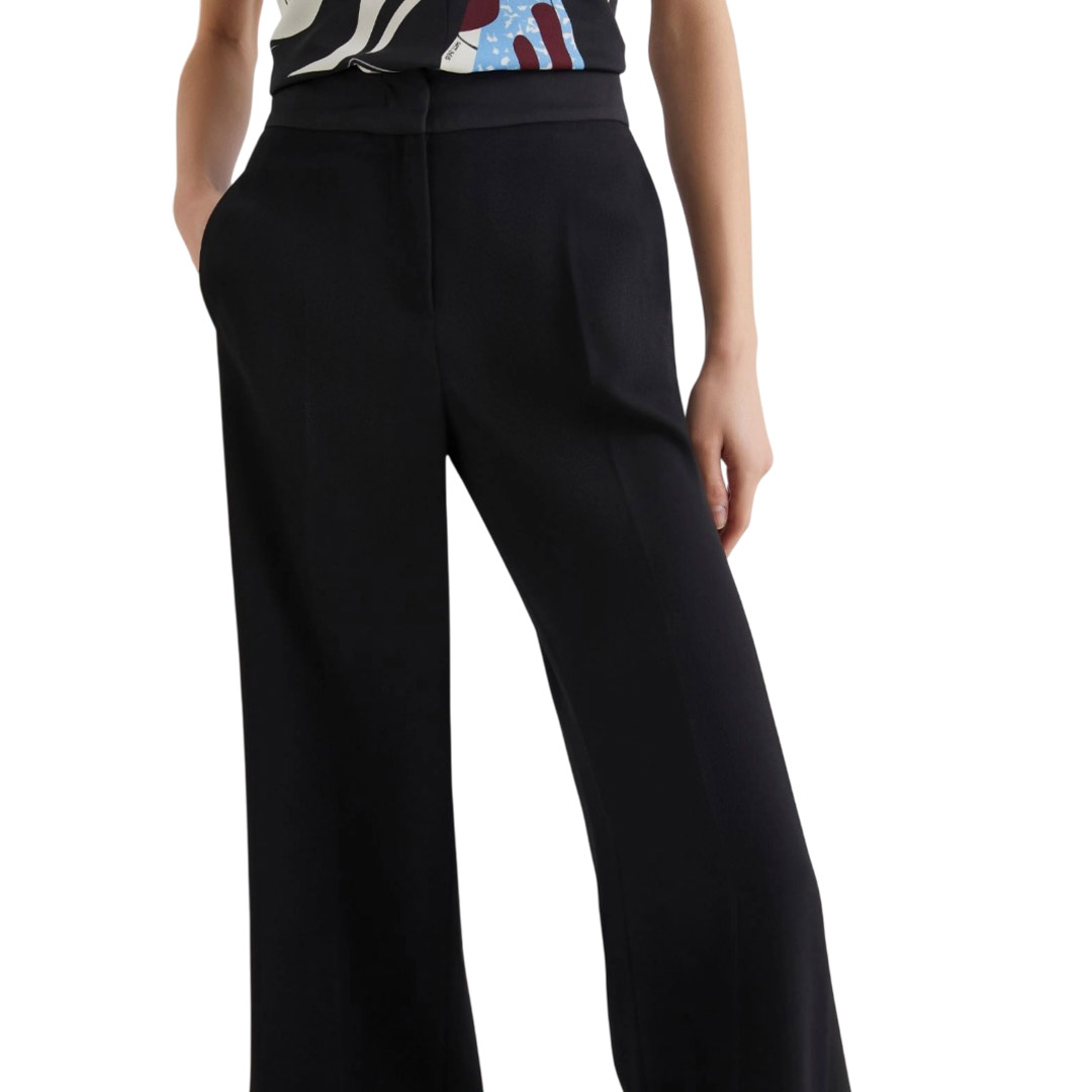 Nuovo pantalone di ispirazione maschile, ingentilito dalla fluidità dell'envers satin che slancia la silhouette e ondeggia morbidamente al movimento. L'inserto elastico posteriore assicura un fit impeccabile in ogni occasione. Tessuto principale contenente una percentuale di poliestere riciclato superiore al 50% Pantalone in crêpe envers satin Fit dritto Chiusura con gancio a uomo e zip Inserto elastico sul retro della vita e taschino posteriore a filetto Fasce laterali in satin e piega stirata fronte e retro