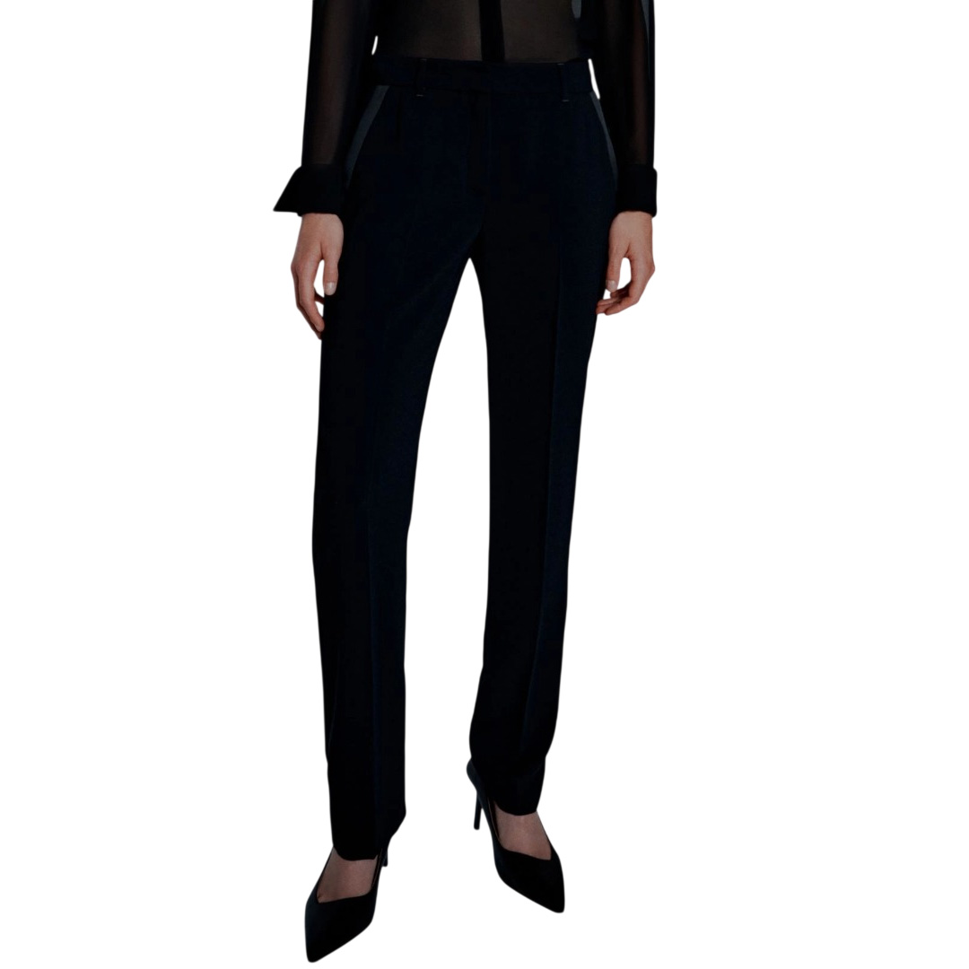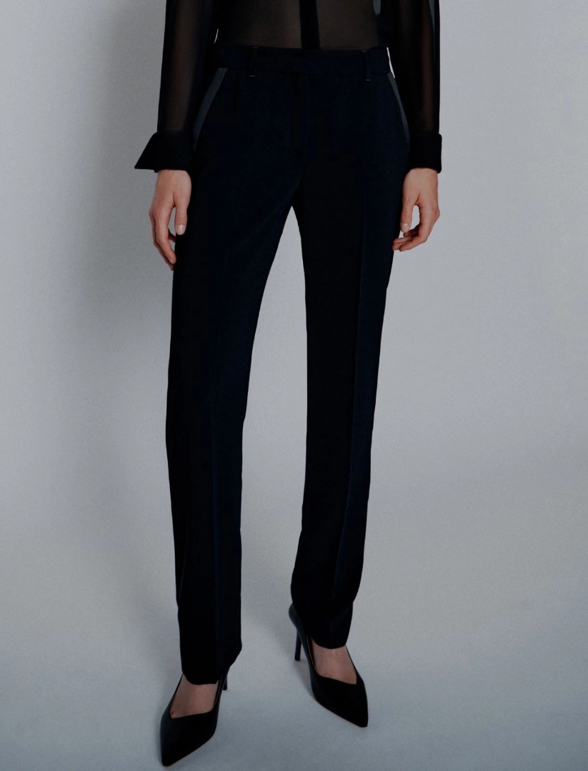 Slancia la silhouette e diventa subito protagonista dei tuoi look questo pantalone dal fit dritto completato da una cintura con fibbia metallica. La costruzione impeccabile si presta a comporre mix urbani eleganti, con bluse fluide, camicie in popeline e blazer dal taglio contemporaneo. Tessuto principale contenente una percentuale di poliestere riciclato superiore al 50% Pantalone in crêpe envers satin con dettagli in satin Fit regolare Passanti in vita e cintura con fibbia in metallo Tasche laterali alla francese e posteriore a filetto Piega stirata fronte e retro