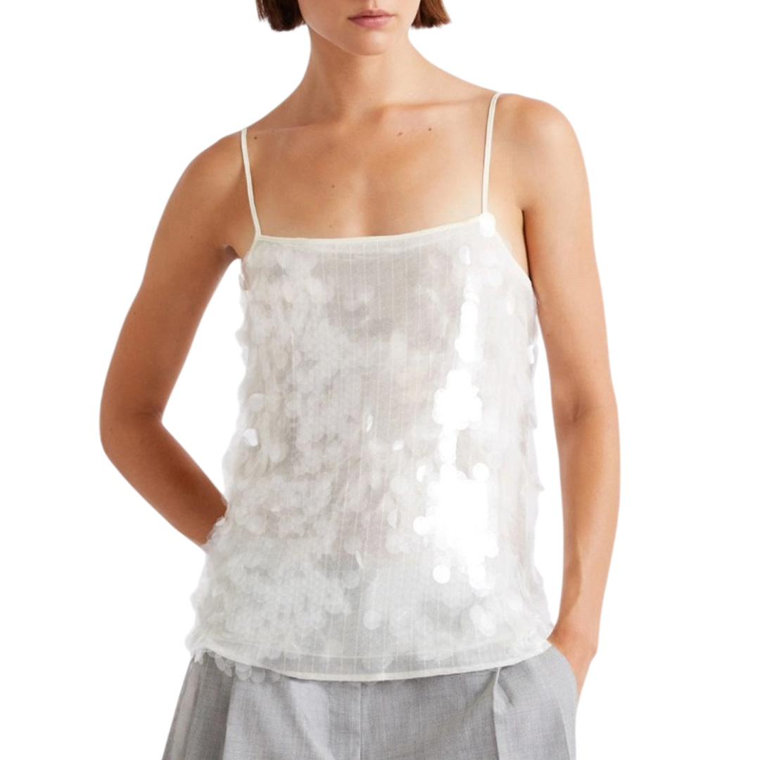 Pensato per le serate più cool, perfetto anche sotto un blazer: lo slip top si arricchisce del fascino glamour delle paillette. Mixalo agli short in misto lino o abbinalo ai denim preferiti, sarà subito party. Slip top in tulle con paillette applicate Fit regolare Scollo dritto Spalline sottili Modello sfoderato