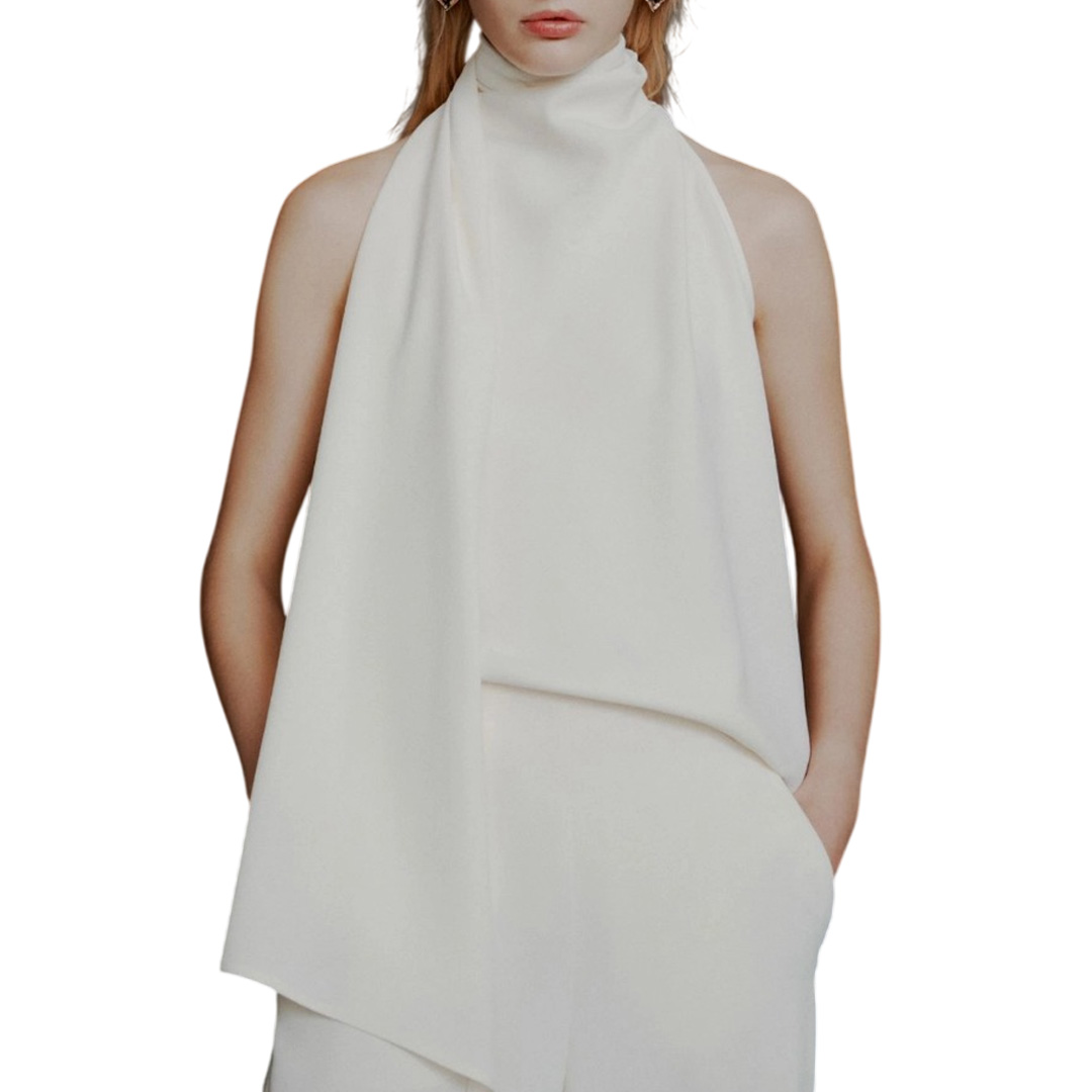 Top dall'allure metropolitana ed elegante, con spalle scoperte e lunga fusciacca da annodare al collo. Linea scivolata sul busto, per abbinarsi armoniosamente a pantaloni palazzo o pencil skirt. Tessuto principale contenente una percentuale di poliestere riciclato superiore al 50% Top in crêpe envers satin Fit regolare Scollo all'americana con nastro posteriore da annodare Modello smanicato Fondo dritto