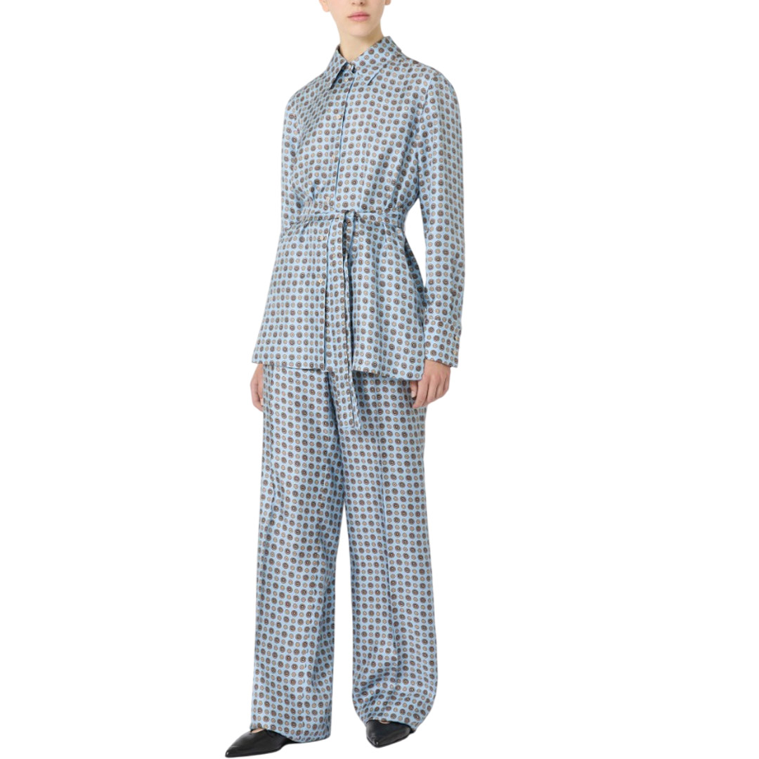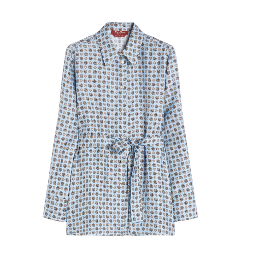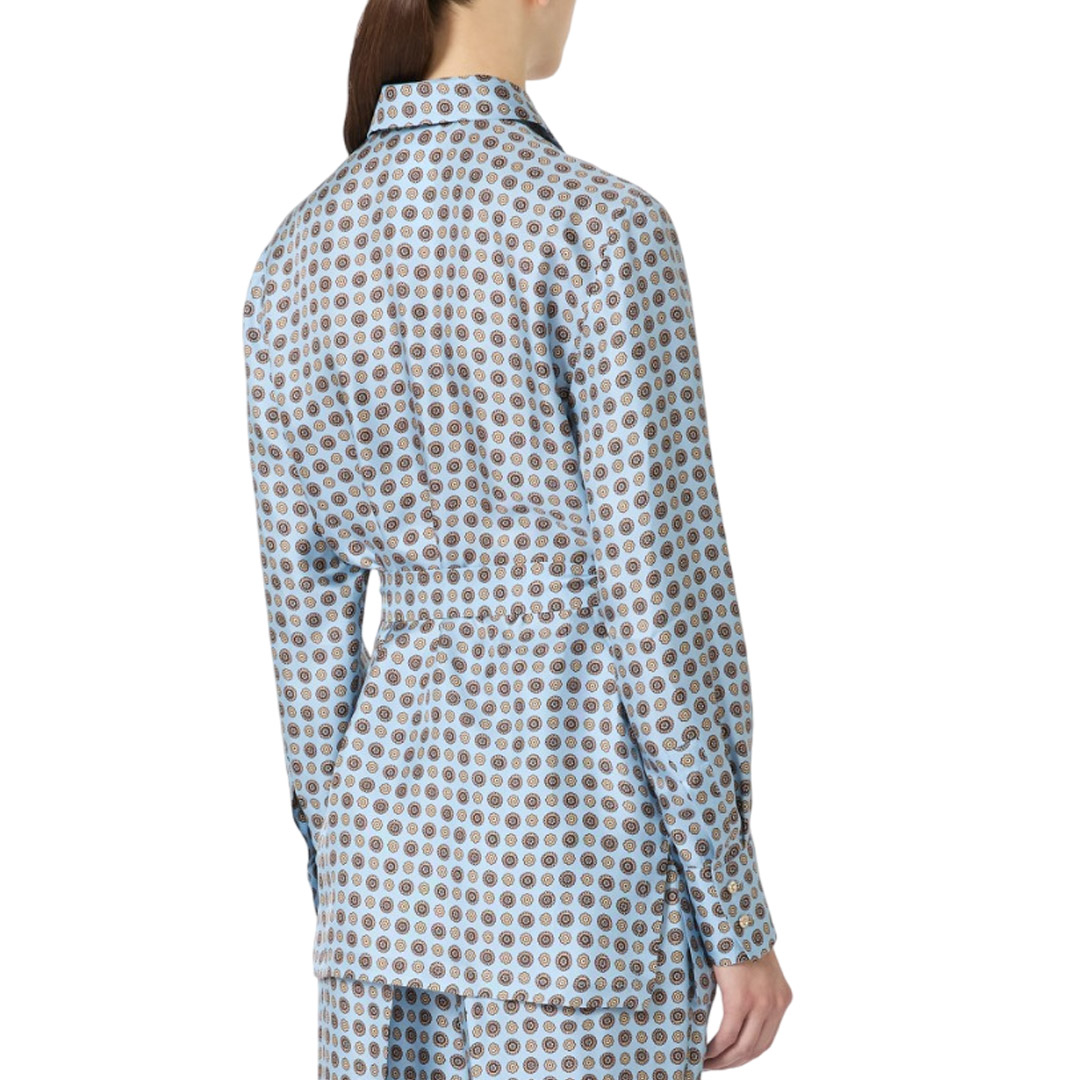 Camicia con cintura annodata in vita ad evidenziare la silhouette. Camicia in twill di pura seta stampata Linea dritta Colletto a punta Maniche lunghe a giro con polsino e bottone laterale Chiusura frontale con bottoni gioiello Piccoli spacchi squadrati laterali