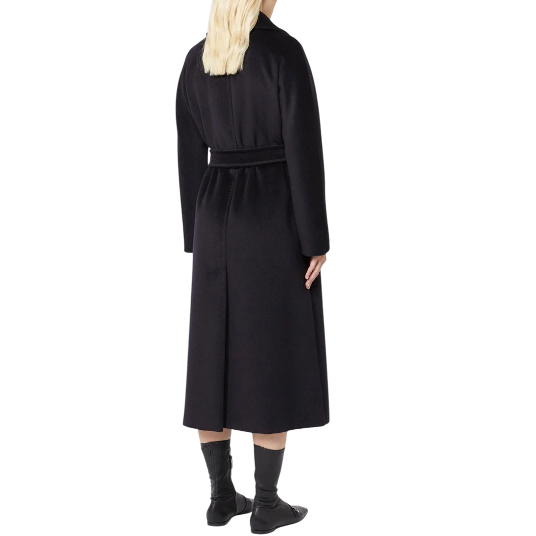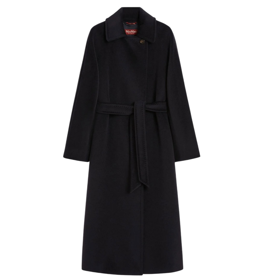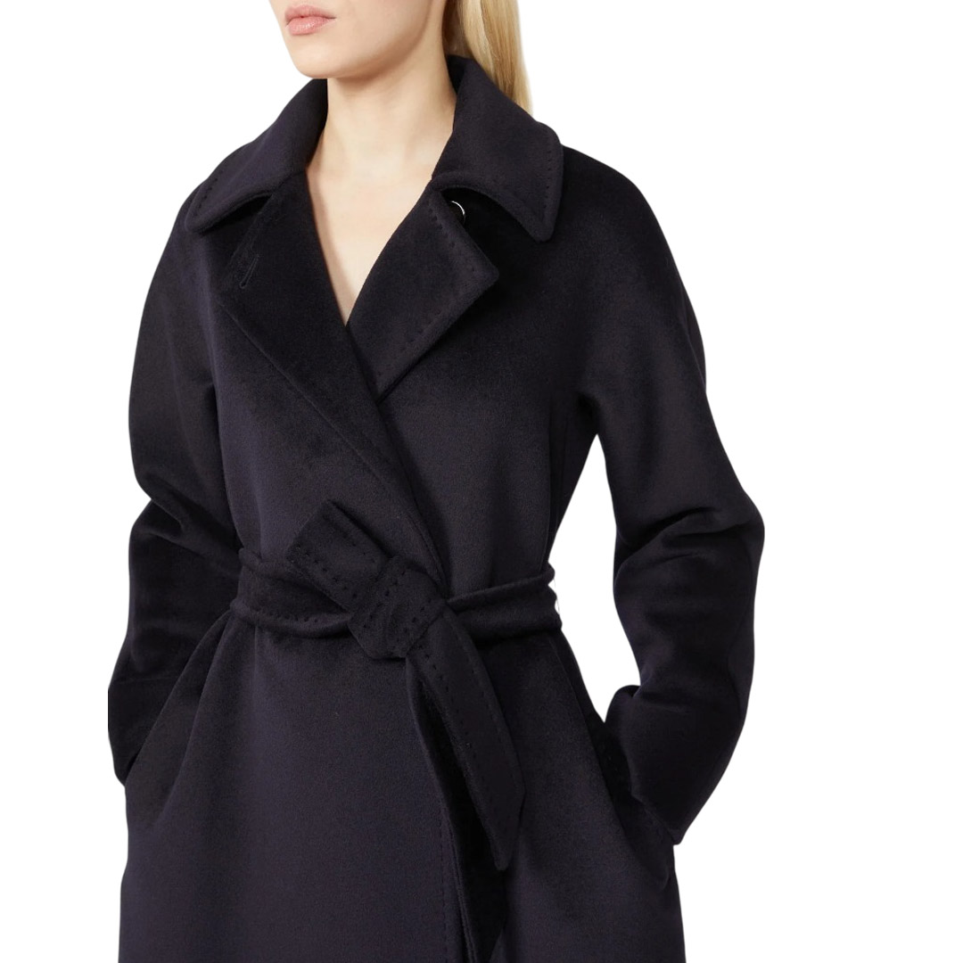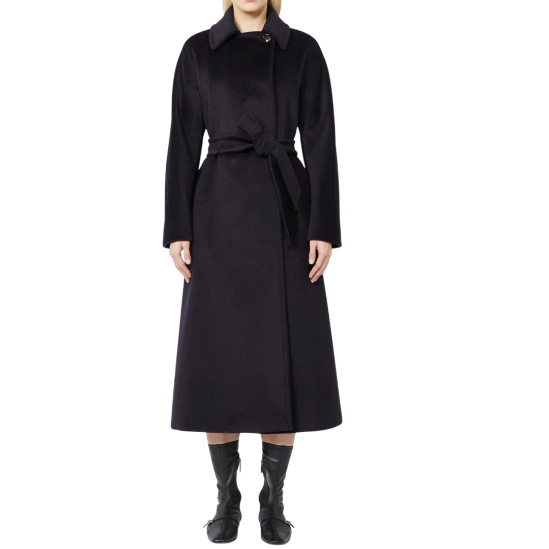 Cappotto midi a vestaglia, rifinito con puntino sartoriale. Cappotto in beaver di pura lana Linea svasata con spacco sul retro Colletto doppio uso da portare aperto a rever o chiuso con bottone Maniche lunghe a kimono Chiusura con cintura abbinata in vita Tasche inserite nei fianchi Foderato