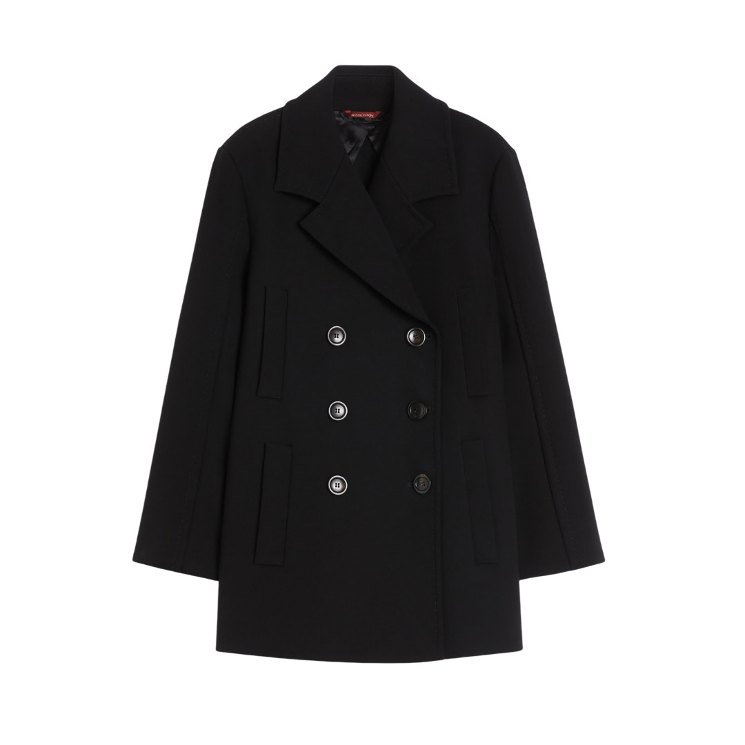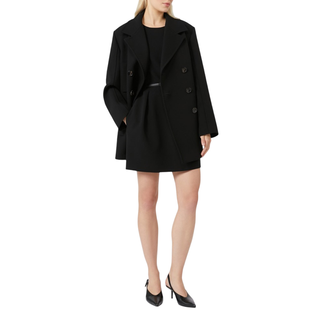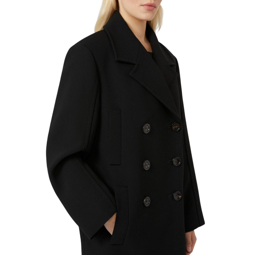 Caban doppiopetto dalla linea leggermente allungata e chiusa al fondo. Caban in cady pesante Collo a rever ampi Maniche lunghe con motivo di tagli nel sottomanica Chiusura frontale con bottoni Tasche scaldamani e a filettone sui fianchi Foderato Taglio centrale sulla schiena