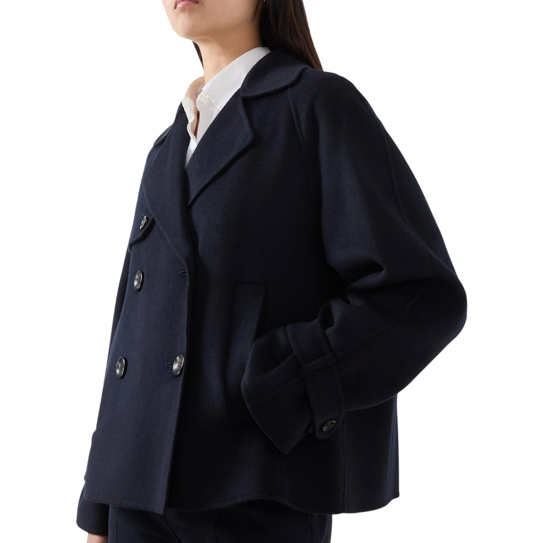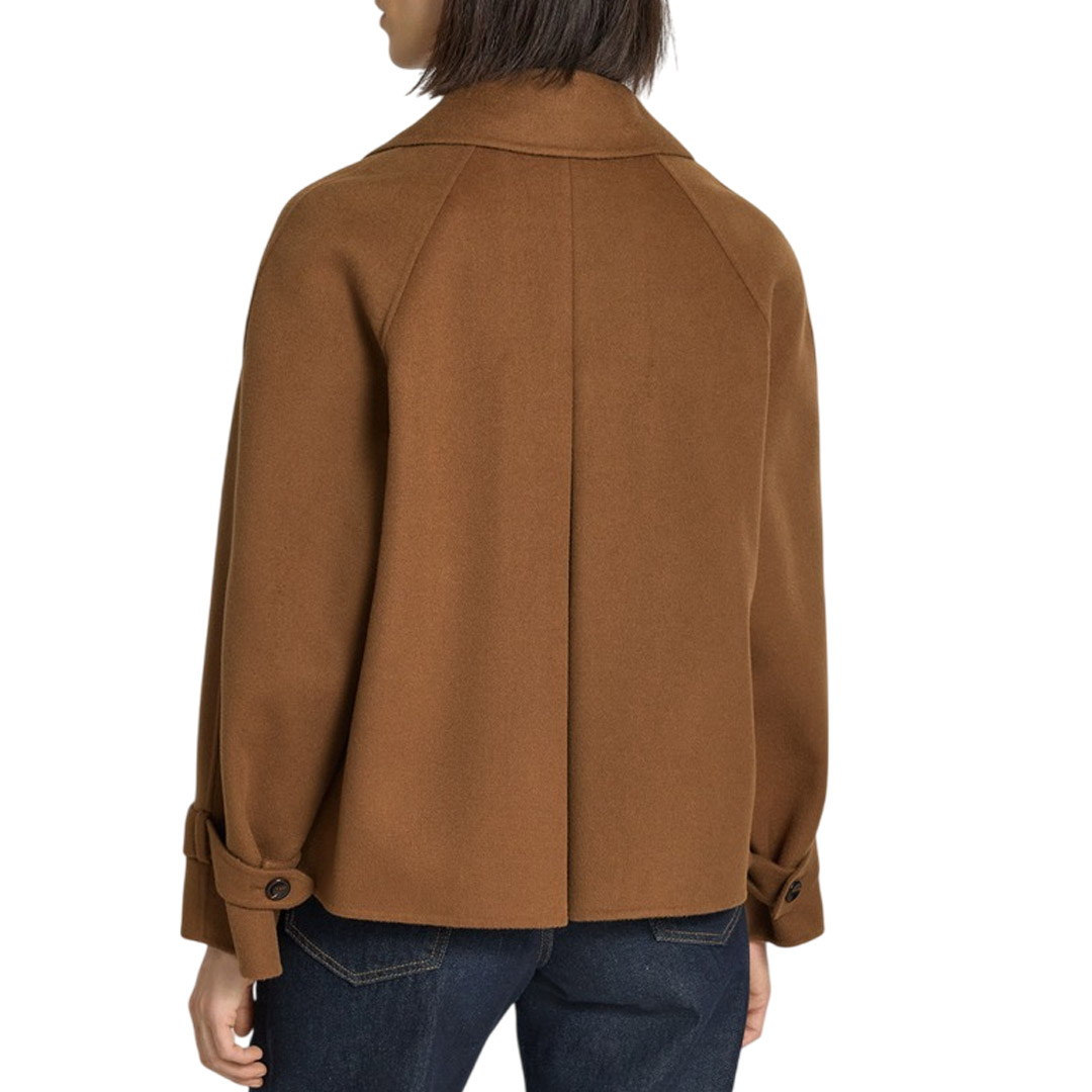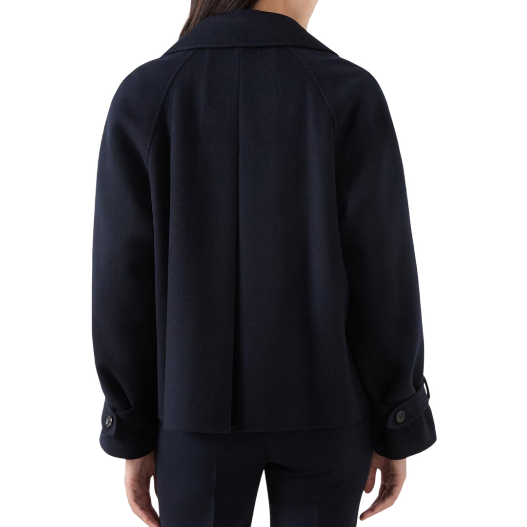 Caban doppiopetto con iconici dettagli stile trench. Caban in double drap di lana, cashmere e seta Vestibilità squadrata Colletto con revers Maniche raglan con alamari sui polsini Chiusura con bottoni in tinta Tasche a filetto sui fianchi Bavolet sul davanti e contropiega sul retro