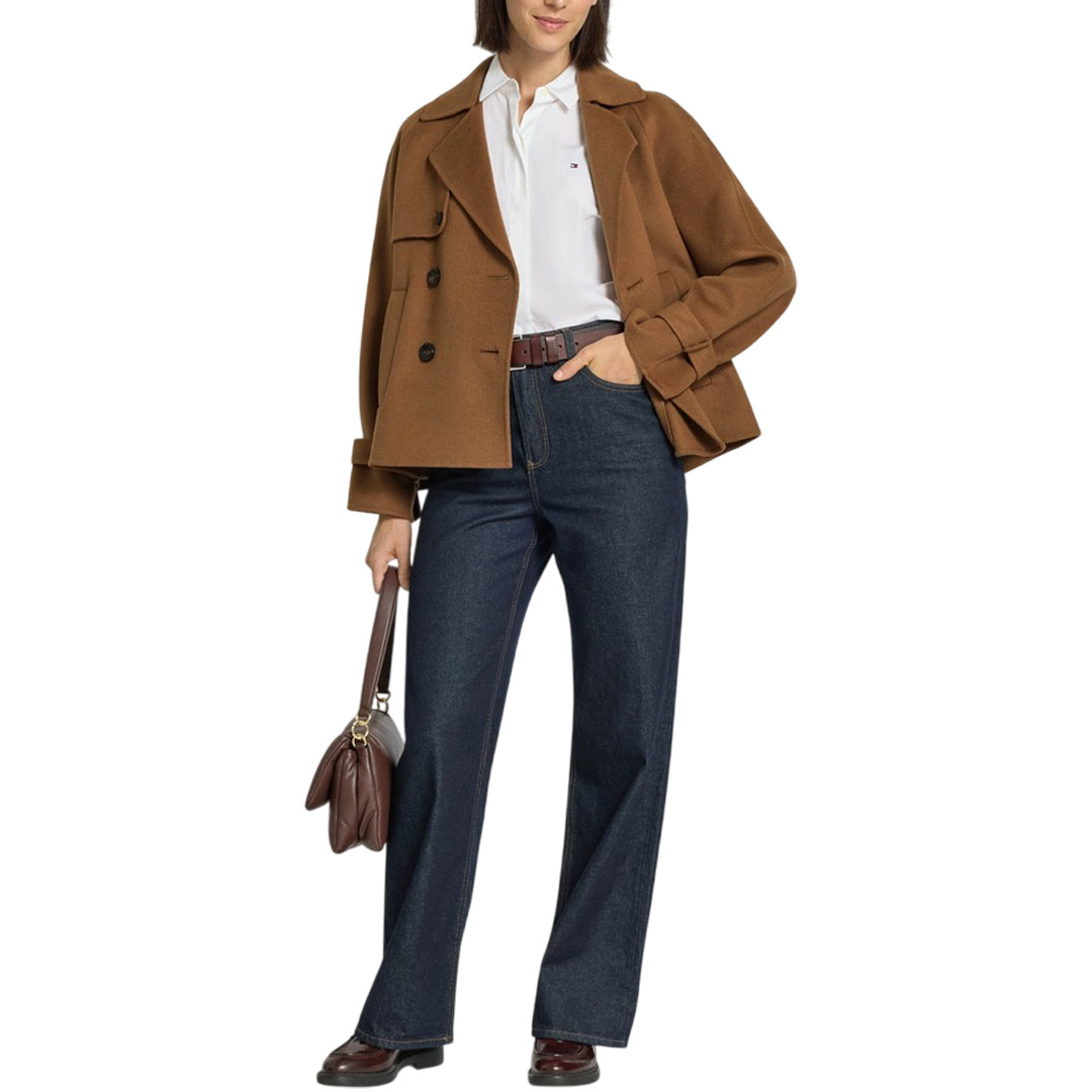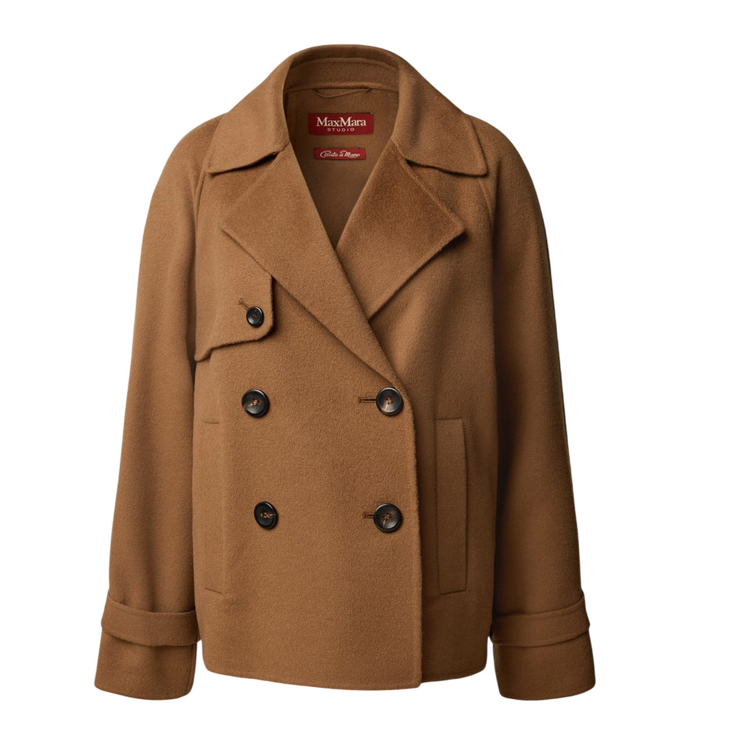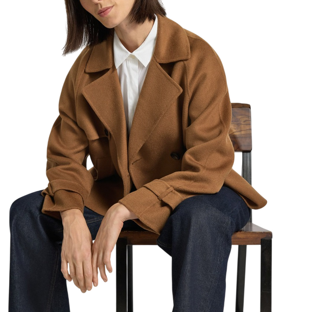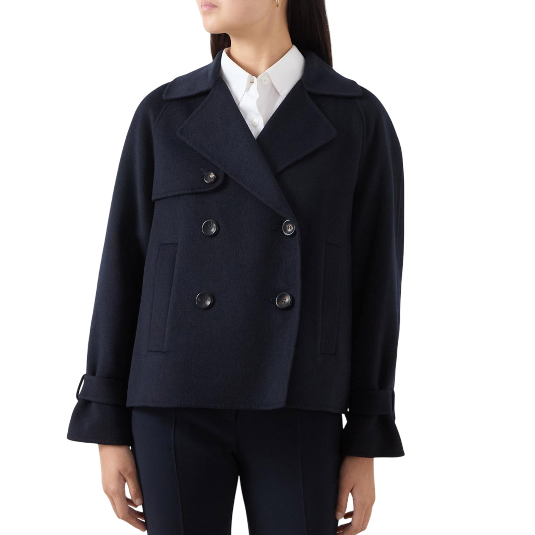 Caban doppiopetto con iconici dettagli stile trench. Caban in double drap di lana, cashmere e seta Vestibilità squadrata Colletto con revers Maniche raglan con alamari sui polsini Chiusura con bottoni in tinta Tasche a filetto sui fianchi Bavolet sul davanti e contropiega sul retro