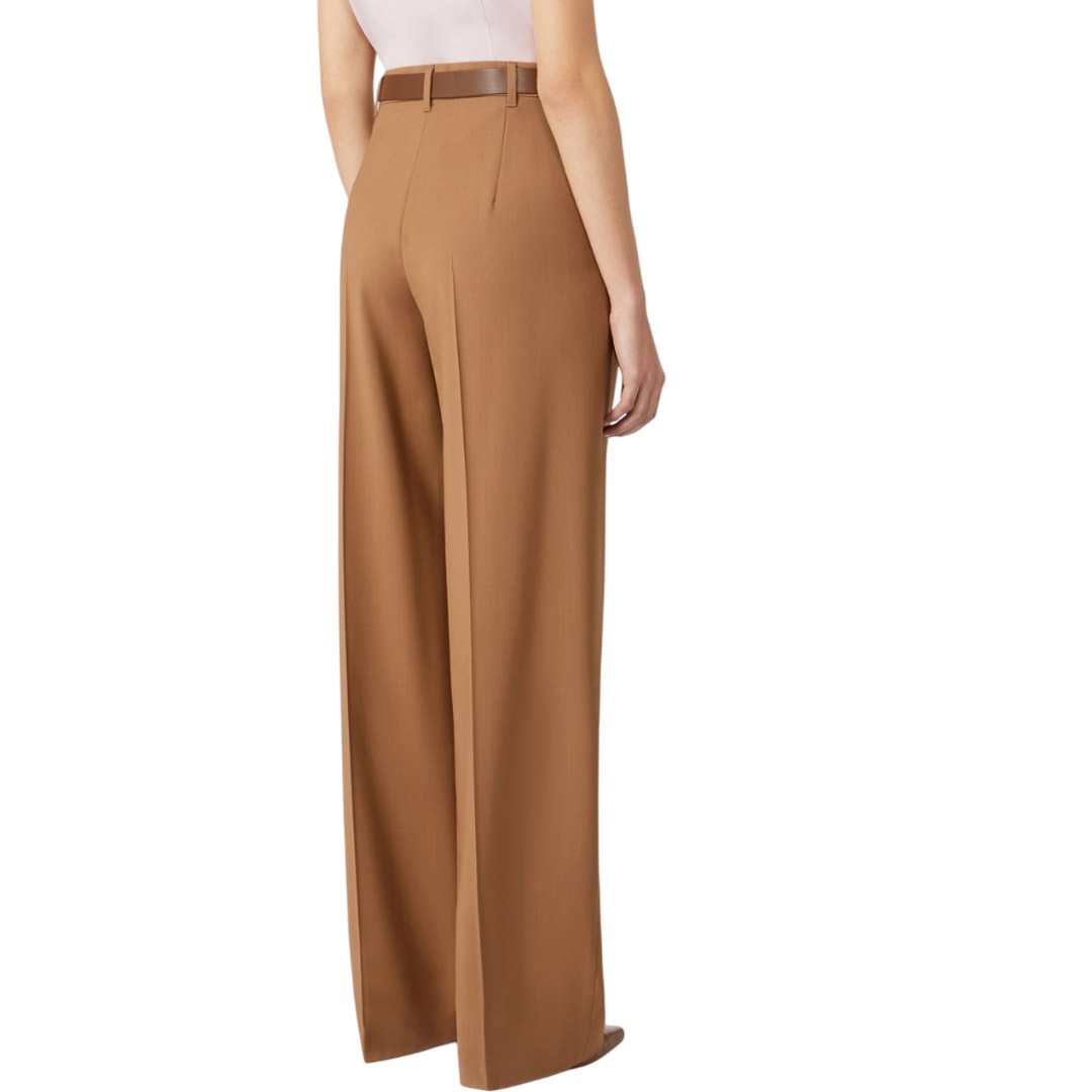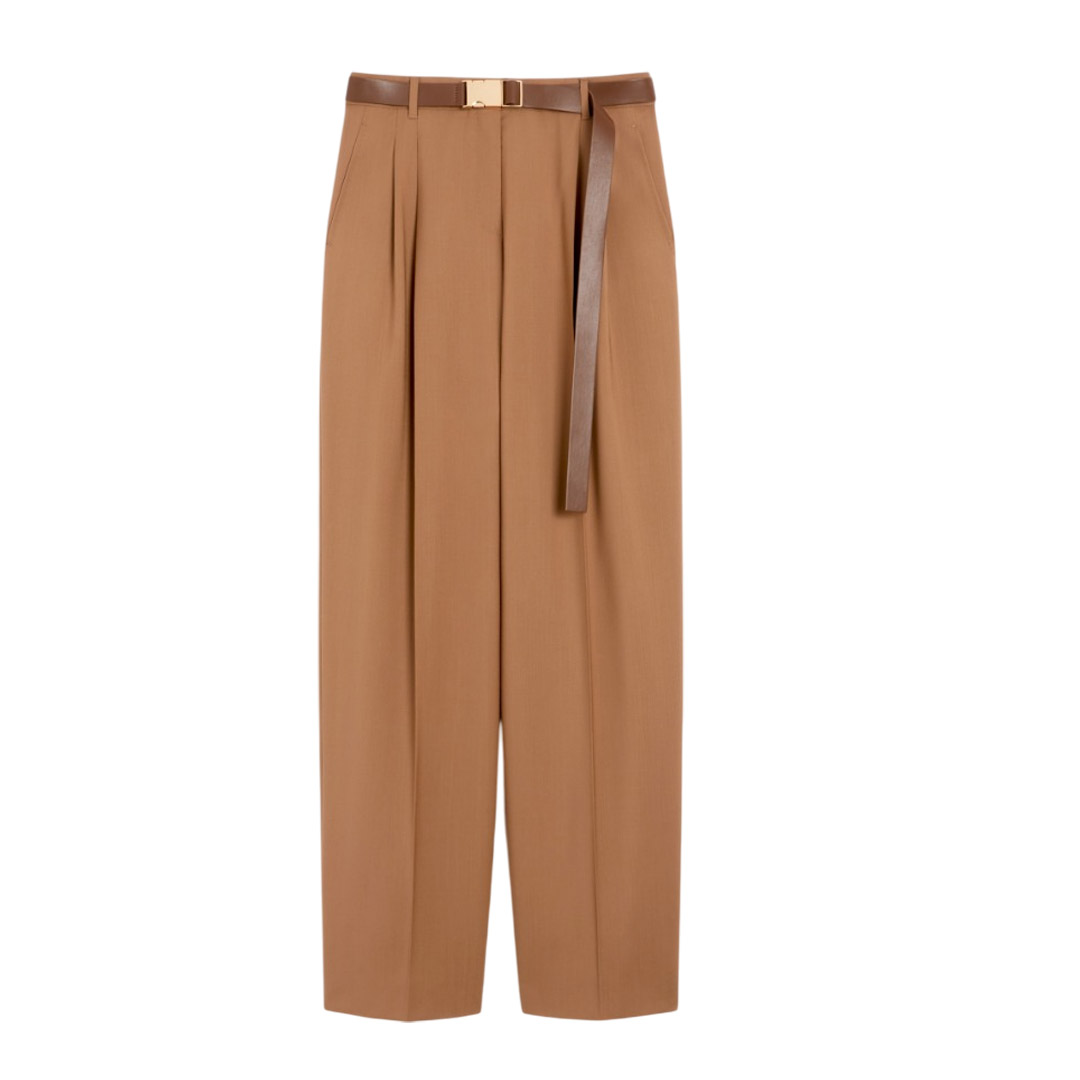 Pantalone con cintura lunga in tessuto spalmato e fibbia in metallo. Pantalone in tela di lana leggera Linea morbida leggermente affusolata al fondo Chiusura con listino alto in vita, zip con patta e gancetto Tasche alla francese sui fianchi Doppia pinces in vita sul davanti Piega stirata davanti e sul retro