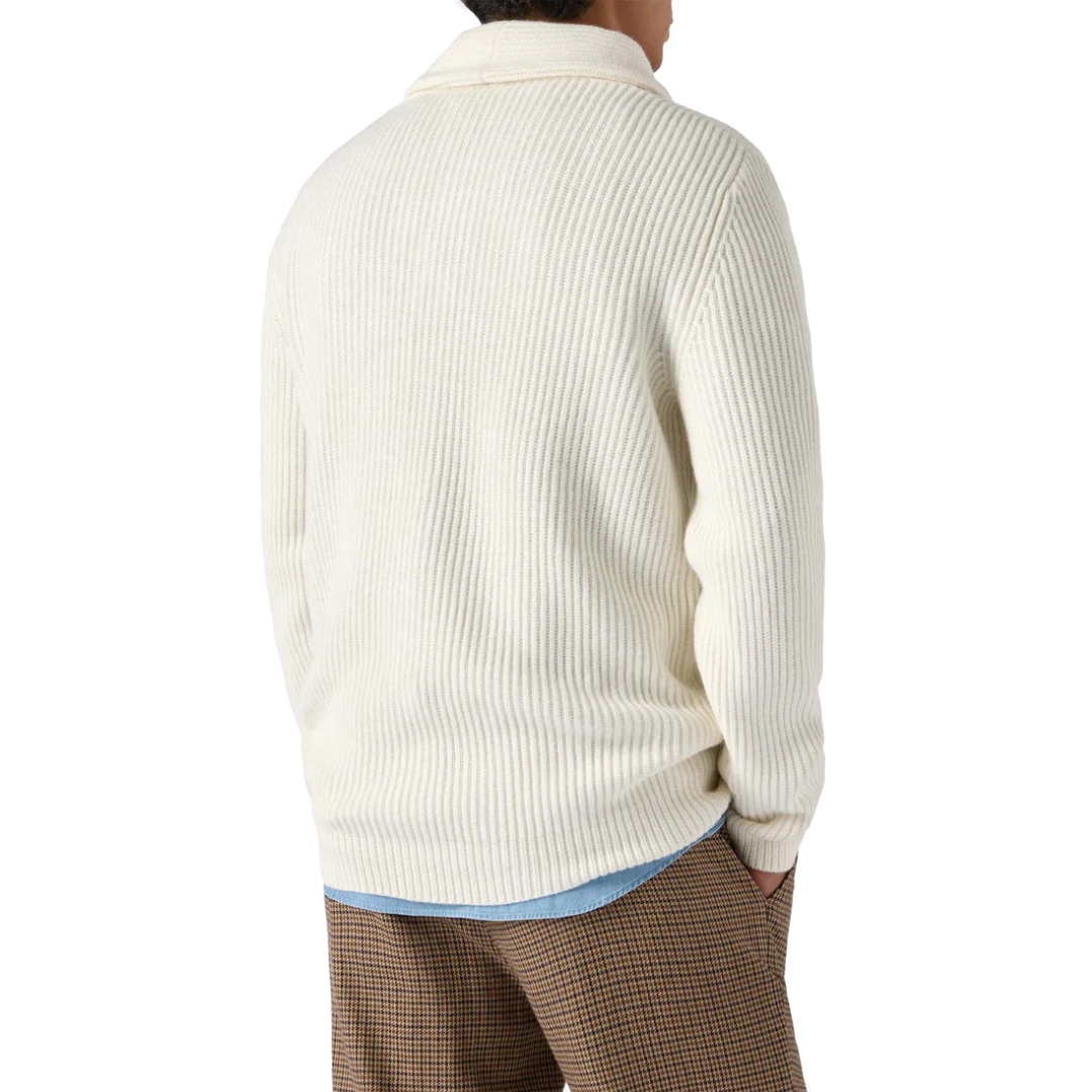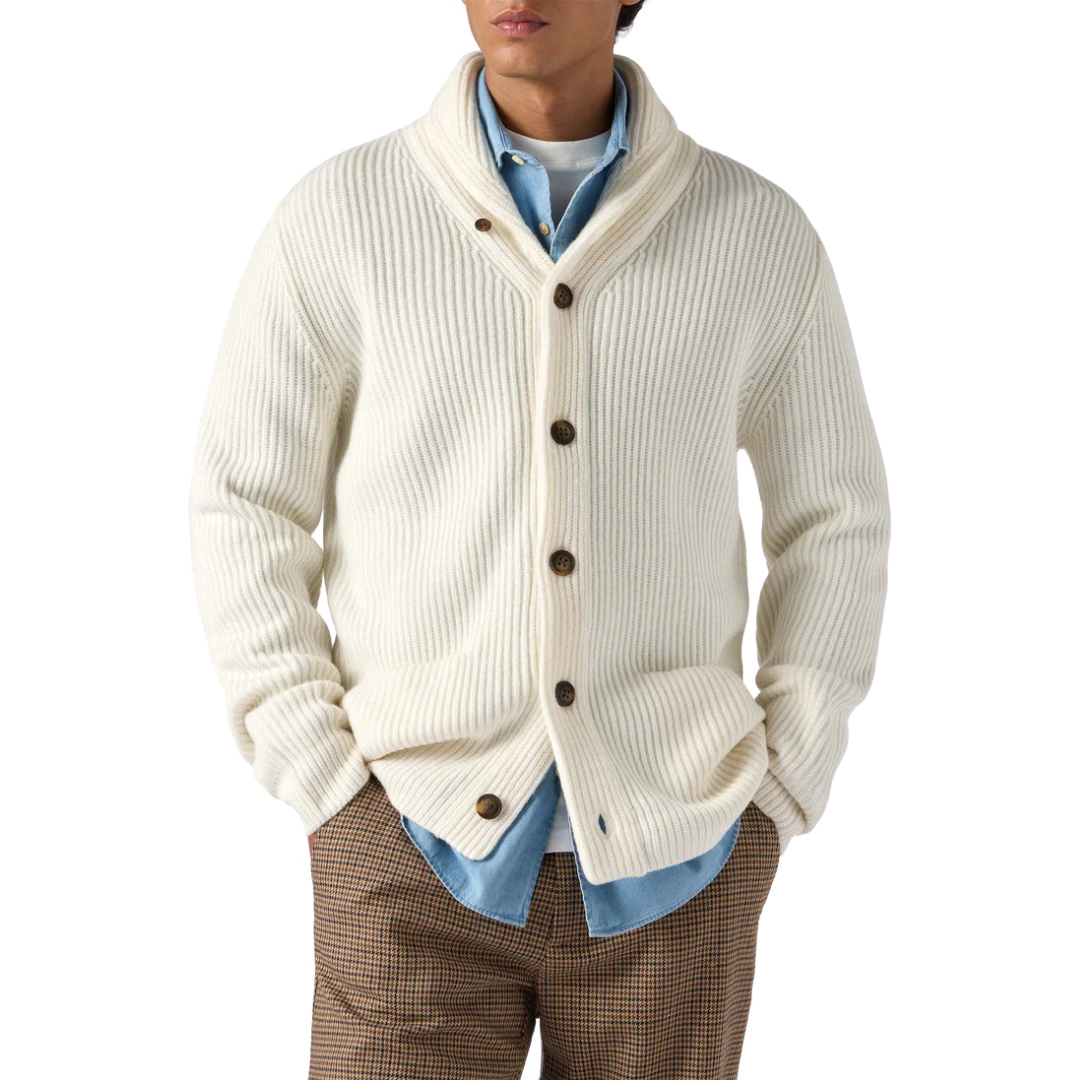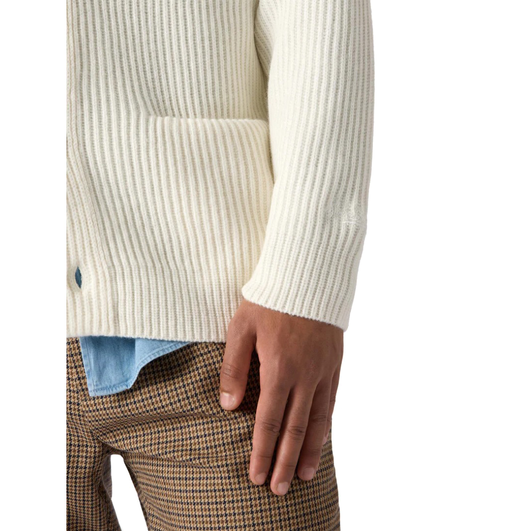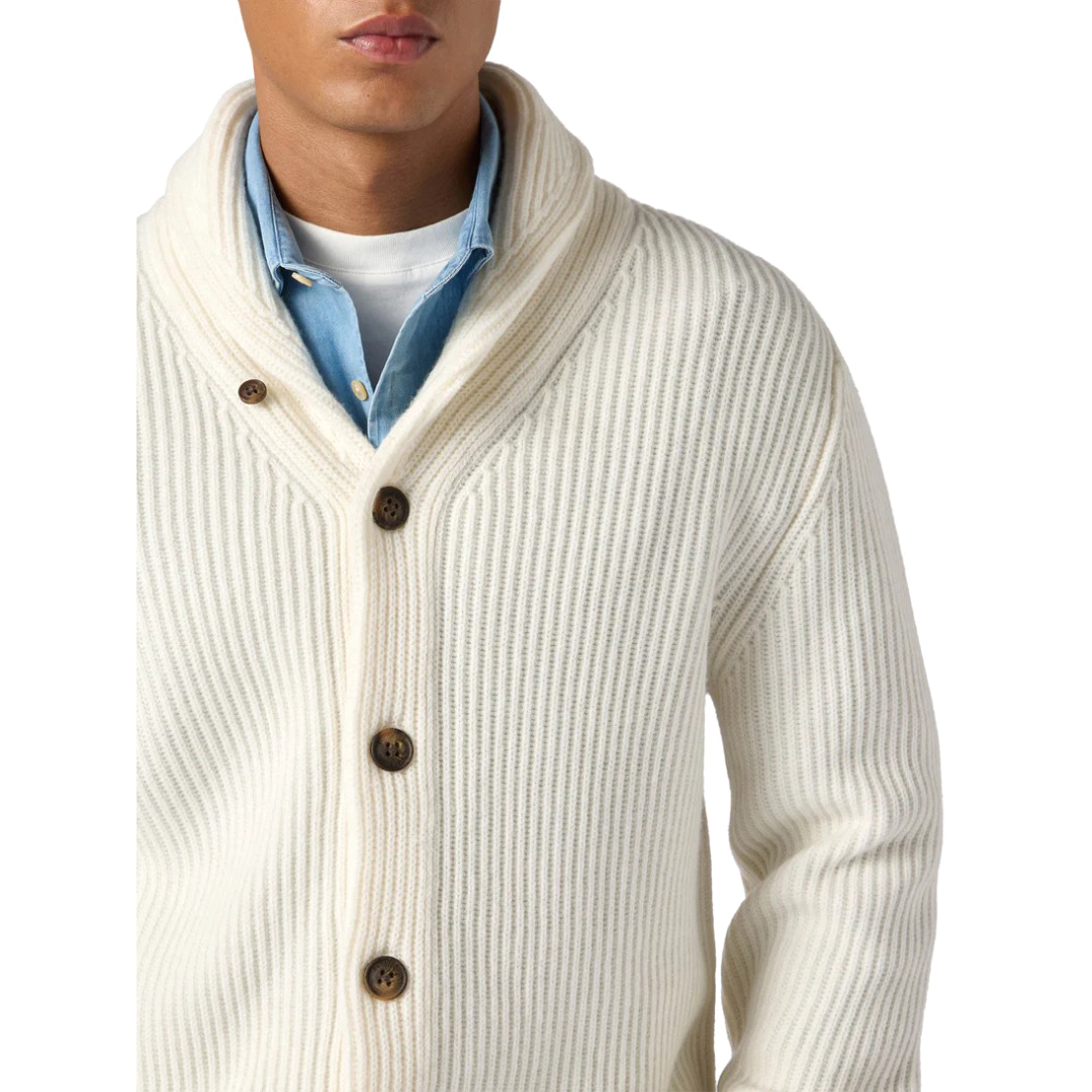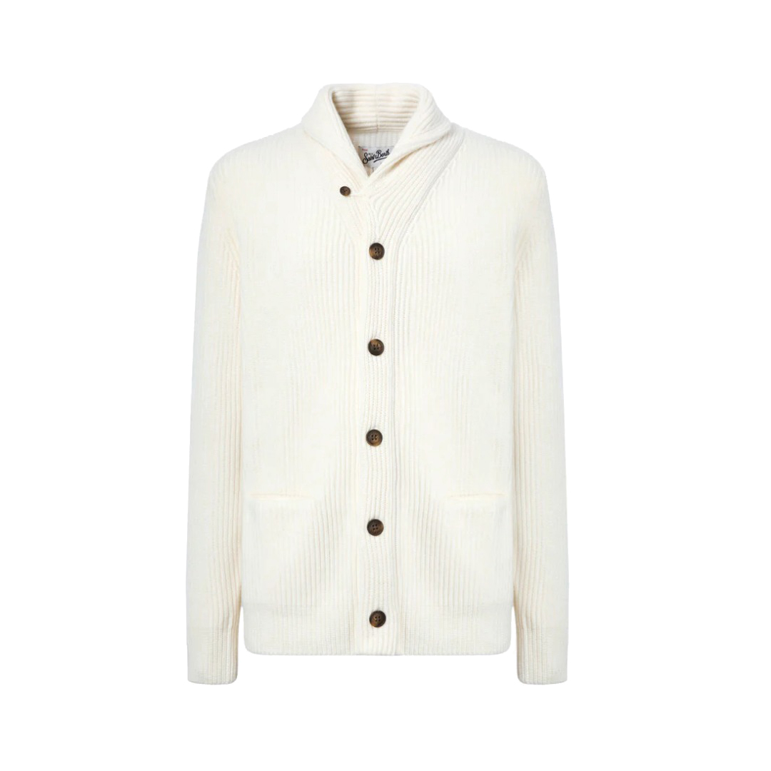 Cardigan Maglia a costa fn. 5 Lana merino cardata Scollo a scialle Tinta unita bianco Maniche lunghe Fondo e polsi a coste Vestibilità regolare Ricamo polso St.Barth. Apertura a bottoni