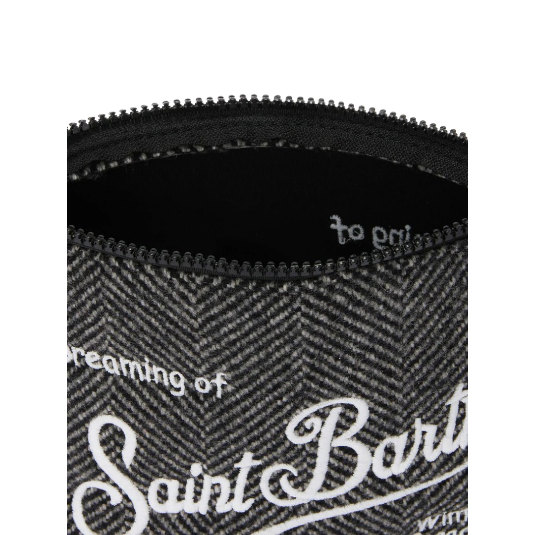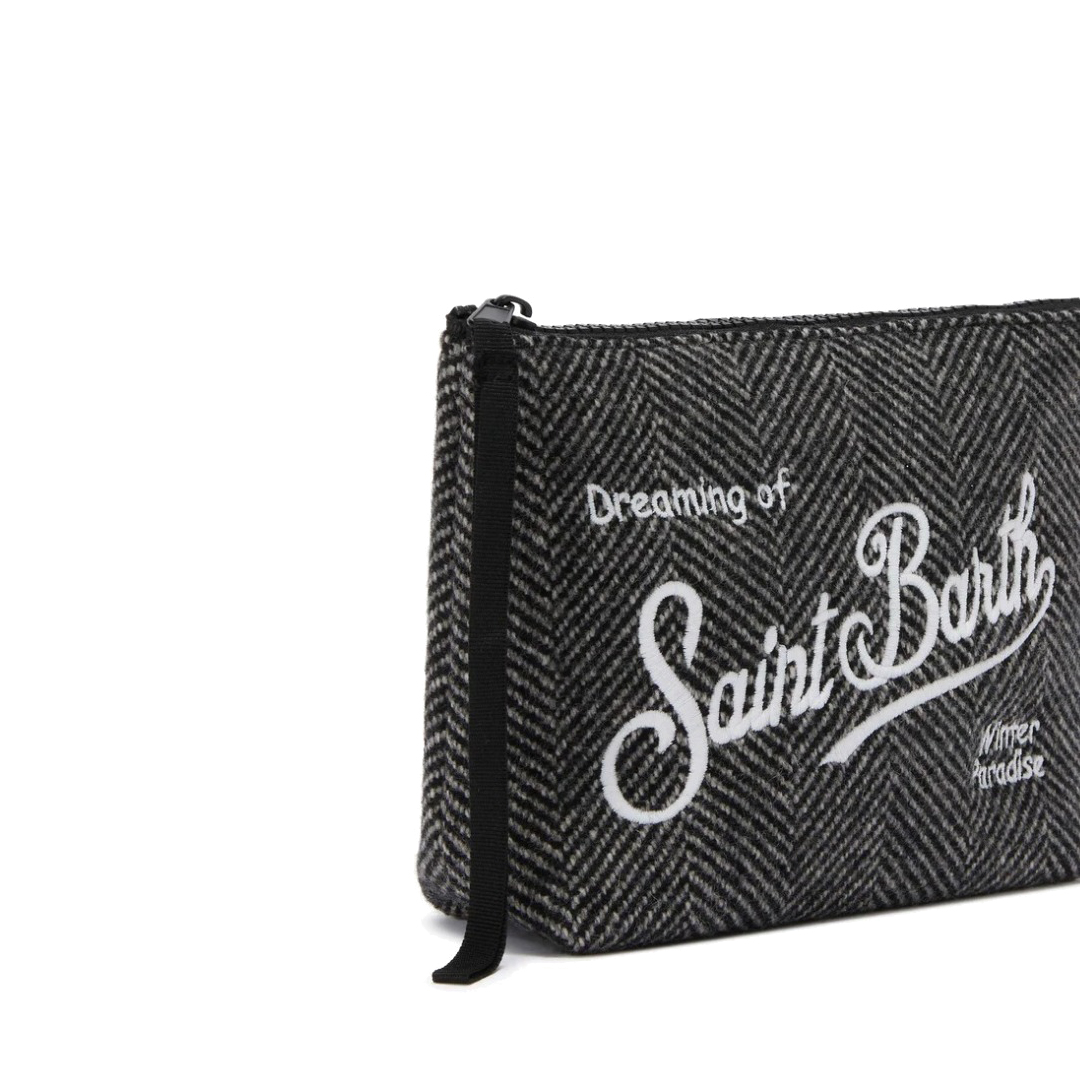 Eleganza e carattere: la stampa spigata per look sofisticati. Pochette in tessuto scuba e misto lana Stampa spinata BR>Passante per polso in gros-grain Logo ricamato Dimensioni: 21 x 15,5 x 7 cm