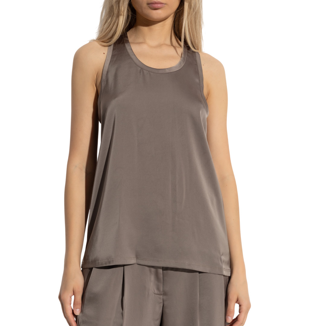 Questa canotta modello vogatore è una rivisitazione lussuosa di un capo essenziale per i mesi più caldi. È realizzata in pregiato raso e si caratterizza per il taglio rilassato che crea un delicato effetto drappeggiato sul corpo. Per un look casual ma raffinato, indossala con i pantaloni abbinati e accessori strutturati.