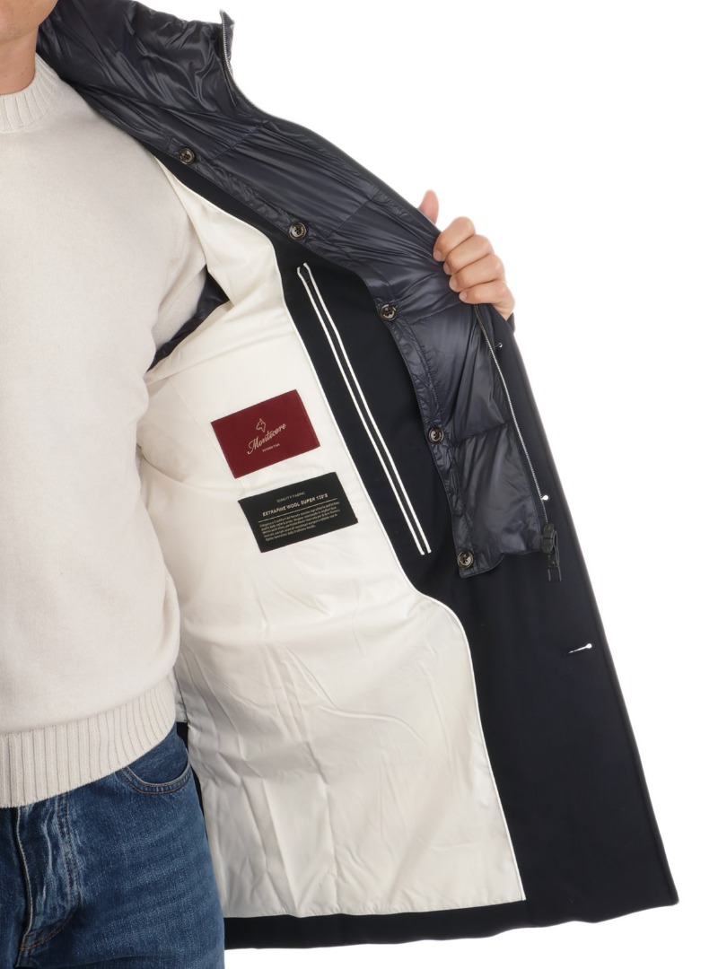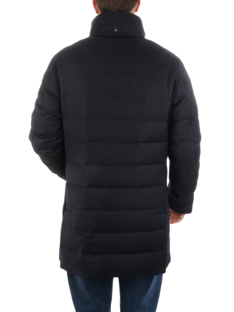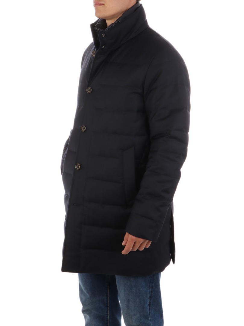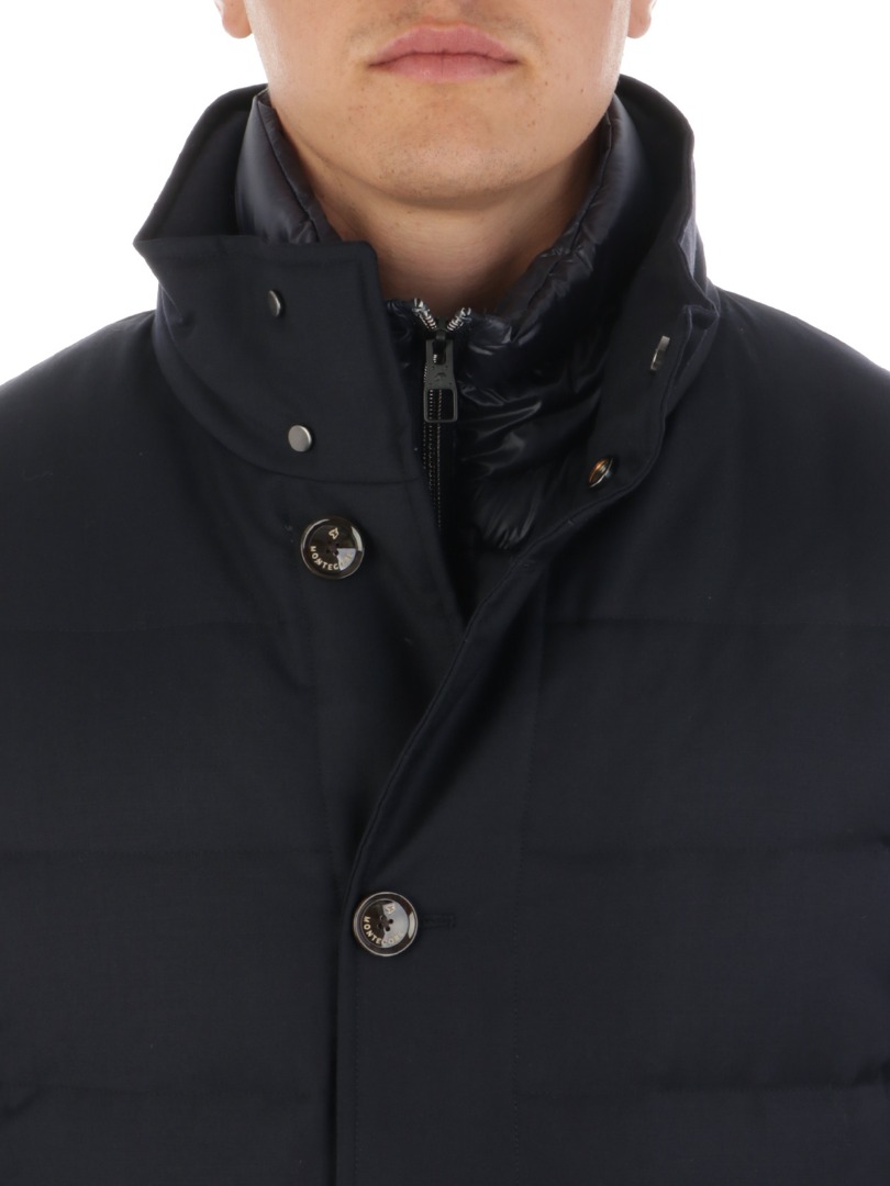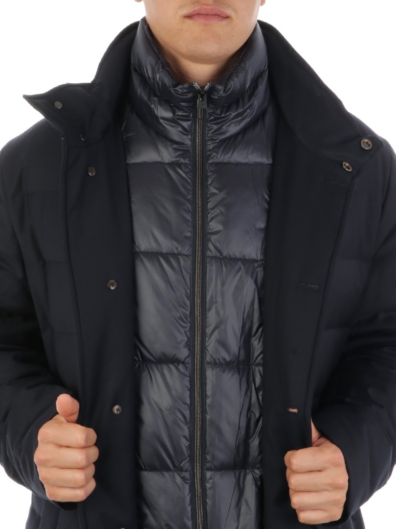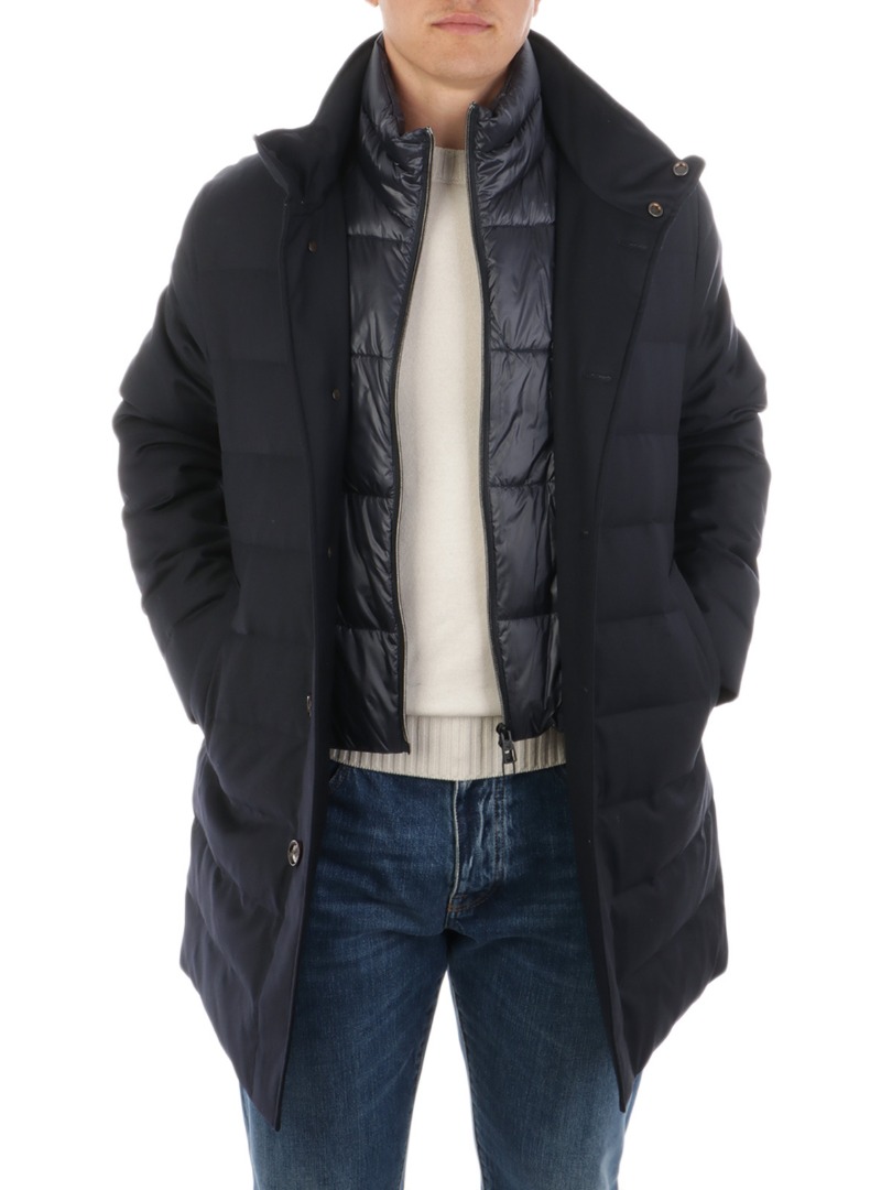 Piumino da uomo in lana trapuntata Imbottito in piumino e piuma Chiusura full-zip e bottoni Davantino trapuntato removibile con chiusura full-zip Tasche laterali a filo Collo in piedi Vestibilità regolare