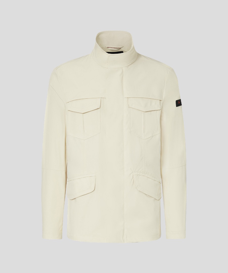 Il giubbino è realizzato in tela di poliestere stretch idrorepellente, con logo sul braccio. Presenta chiusura con zip e bottoni nascosti, colletto alto, tasche sul davanti con patta. Vestibilità regolare.