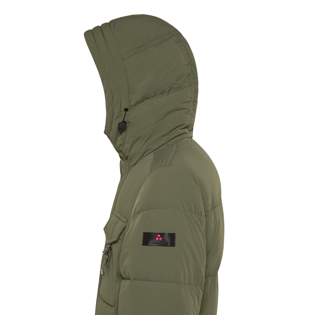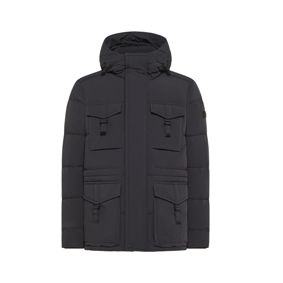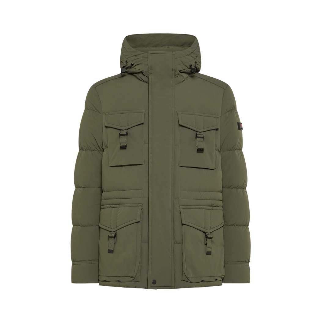 Field jacket in tela stretch realizzata in fibra cava di nylon opaco elasticizzato, che dona al capo comfort, leggerezza e allo stesso tempo volume. L’imbottitura in piuma naturale certificata garantisce un calore avvolgente e massimo comfort nelle giornate più fredde. Il design clean è arricchito da un cappuccio ergonomico e una zip centrale coperta da patta, mentre le quattro tasche frontali con chiusura a fibbia e i polsini antivento neri definiscono un look deciso e funzionale. Novità della linea Linea, i capi sviluppati all’interno di questo concept si distinguono per l’elevata elasticità dei tessuti, che li rende estremamente confortevoli, minimali nel design e altamente adattabili alle forme del corpo, ideali per uno stile essenziale che non rinuncia alla funzionalità. Il trattamento idrorepellente PFC Free assicura protezione dalle intemperie senza l’impiego di sostanze dannose per l’ambiente. Un capo che si fa notare per il suo stile urbano e contemporaneo, perfetto per chi vuole sentirsi protetto senza rinunciare ad un tocco di eleganza. Full zip centrale coperta da patta Lunghezza: media In tela di nylon stretch Cappuccio fisso Down proof Imbottitura in piuma naturale certificata Quattro tasche frontali con fibbia Trattamento idrorepellente PFC free